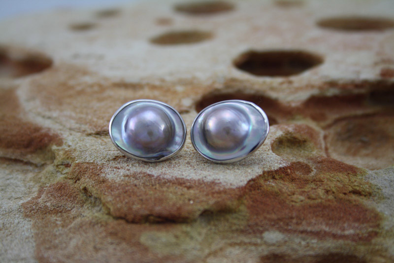 Product Code SKU5041. Sterling Silver mabe earring 22mm x 17mm. Mabe pearls are seeded half pearls using the same type of shell as is used for growing South Sea and Keshi Pearls. These pearls are formed around half sphere seeds attached to the inside of the shell which is then returned to the ocean to allow the pearl animal the opportunity to grow a coating of nacre over the seed which forms the Mabe Pearl. Beautifully presented in a gift box.