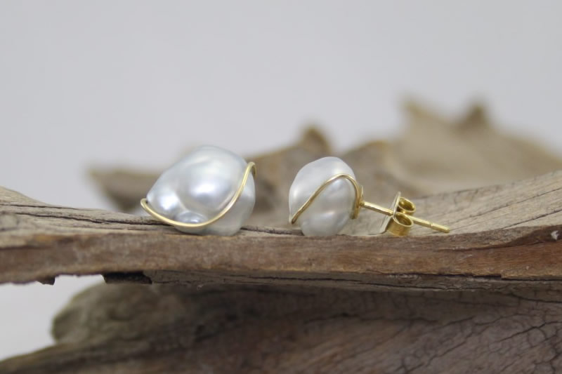Product Code SKU2056. 18ct Yellow Gold South Sea Keshi Studs with a total of 1.8grm Keshi pearls. Keshi Pearls are unique pearls that have grown without a culture seed hence the often odd shapes. This type of pearl is not exclusive to South Sea pearl farms, however these pearls are highly sort after by Driftwood Jewellers due to their free shapes and high lustre giving our jewellers an opportunity to create one off pieces that results in a individual jewellery piece that is yours alone. Beautifully presented in a gift box.