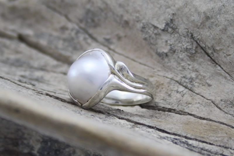Product Code SKU2148. Sterling Silver Mabe Dia ring size R. Mabe size 15mm. Mabe pearls are seeded half pearls using the same type of shell as is used for growing South Sea and Keshi Pearls. These pearls are formed around half sphere seeds attached to the inside of the shell which is then returned to the ocean to allow the pearl animal the opportunity to grow a coating of nacre over the seed which forms the Mabe Pearl. Beautifully presented in a gift box.