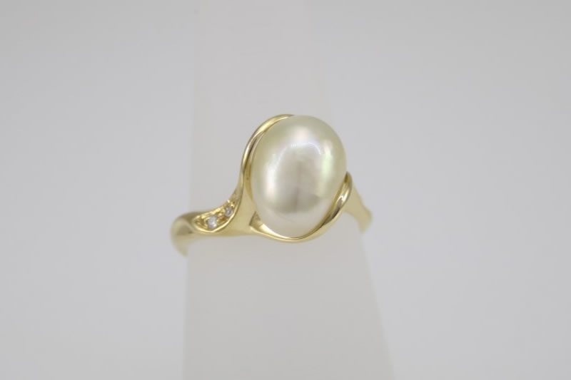 Product Code SKU2038. 18ct Yellow Gold South Sea Keshi Ring Highlighted with 3 points of Diamond Size N with a 1.2grm Keshi pearl. Keshi Pearls are unique pearls that have grown without a culture seed hence the often odd shapes. This type of pearl is not exclusive to South Sea pearl farms, however these pearls are highly sort after by Driftwood Jewellers due to their free shapes and high lustre giving our jewellers an opportunity to create one off pieces that results in a individual jewellery piece that is yours alone. Beautifully presented in a gift box.