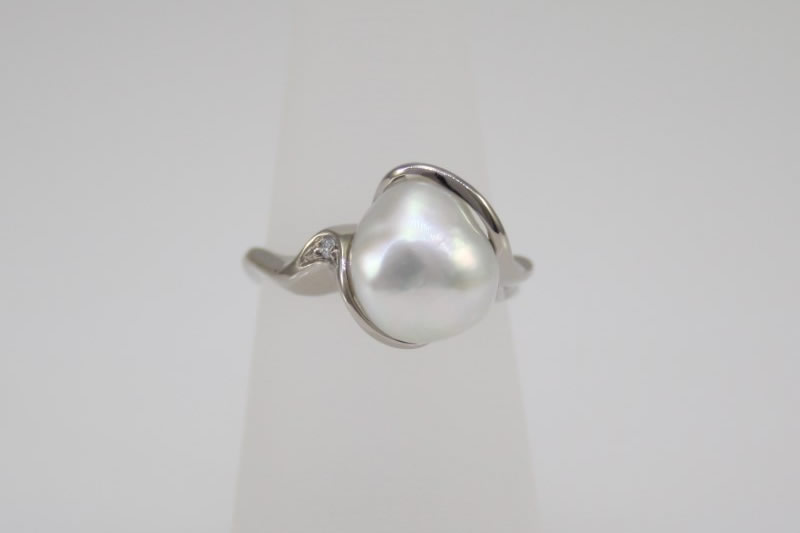 Product Code SKU2042. 18ct White Gold South Sea Keshi Ring with .015 point Diamond Size O with a 1.2grm Keshi pearl. Keshi Pearls are unique pearls that have grown without a culture seed hence the often odd shapes. This type of pearl is not exclusive to South Sea pearl farms, however these pearls are highly sort after by Driftwood Jewellers due to their free shapes and high lustre giving our jewellers an opportunity to create one off pieces that results in a individual jewellery piece that is yours alone. Beautifully presented in a gift box.