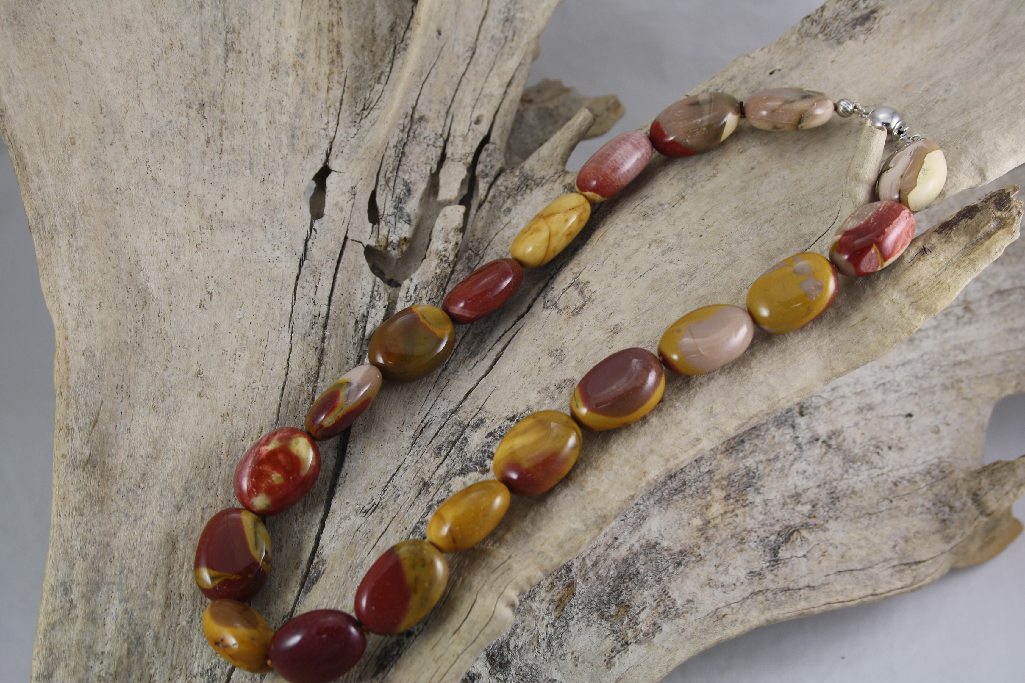 Mookaite flat oval bead knotted necklace 9mm x 22mm x 16mm. Length 42cm.