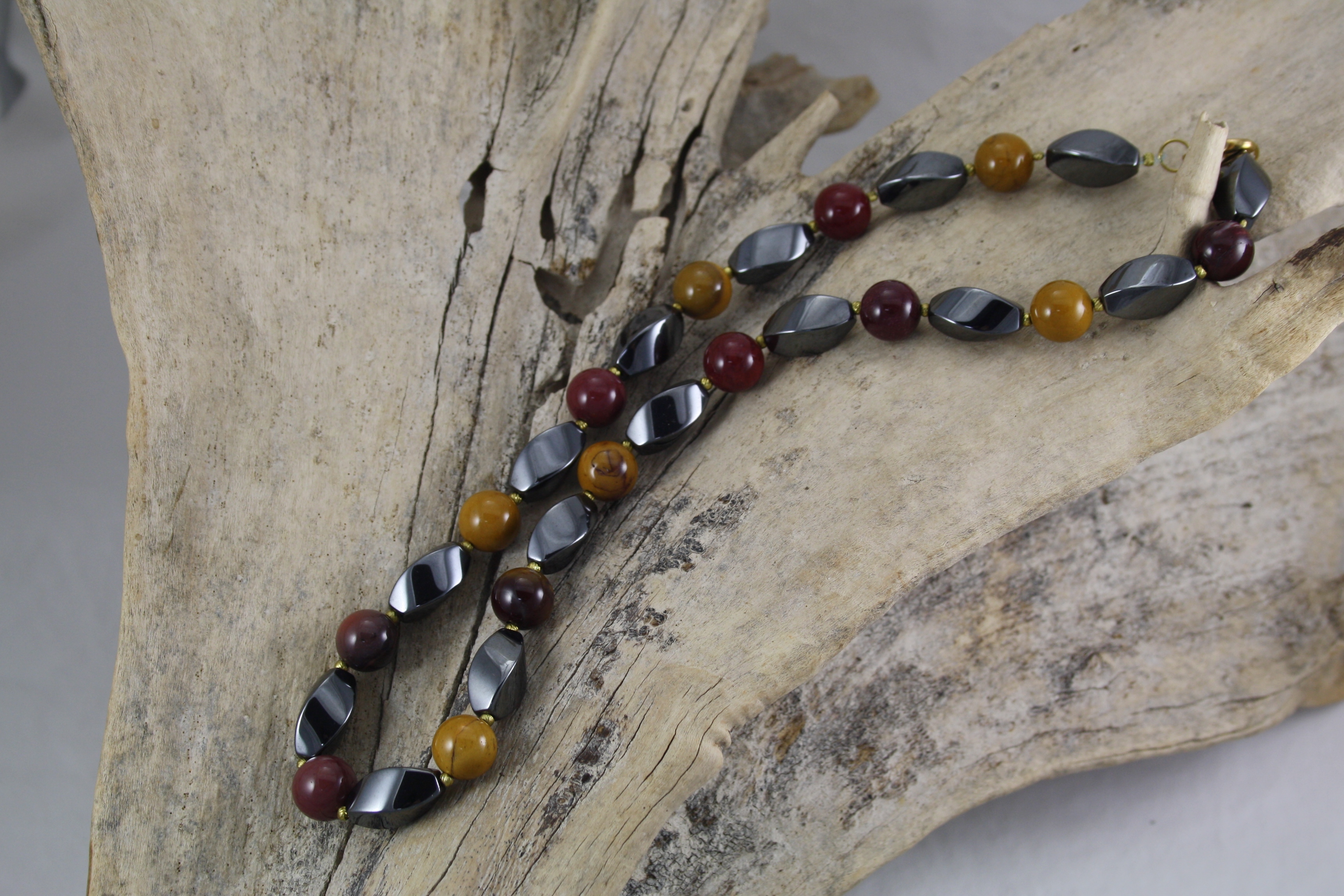 Mookaite round bead 10mm with 15mm x 10mm hematite bead, gold finish beads and gold finish clasp. Length 44cm.