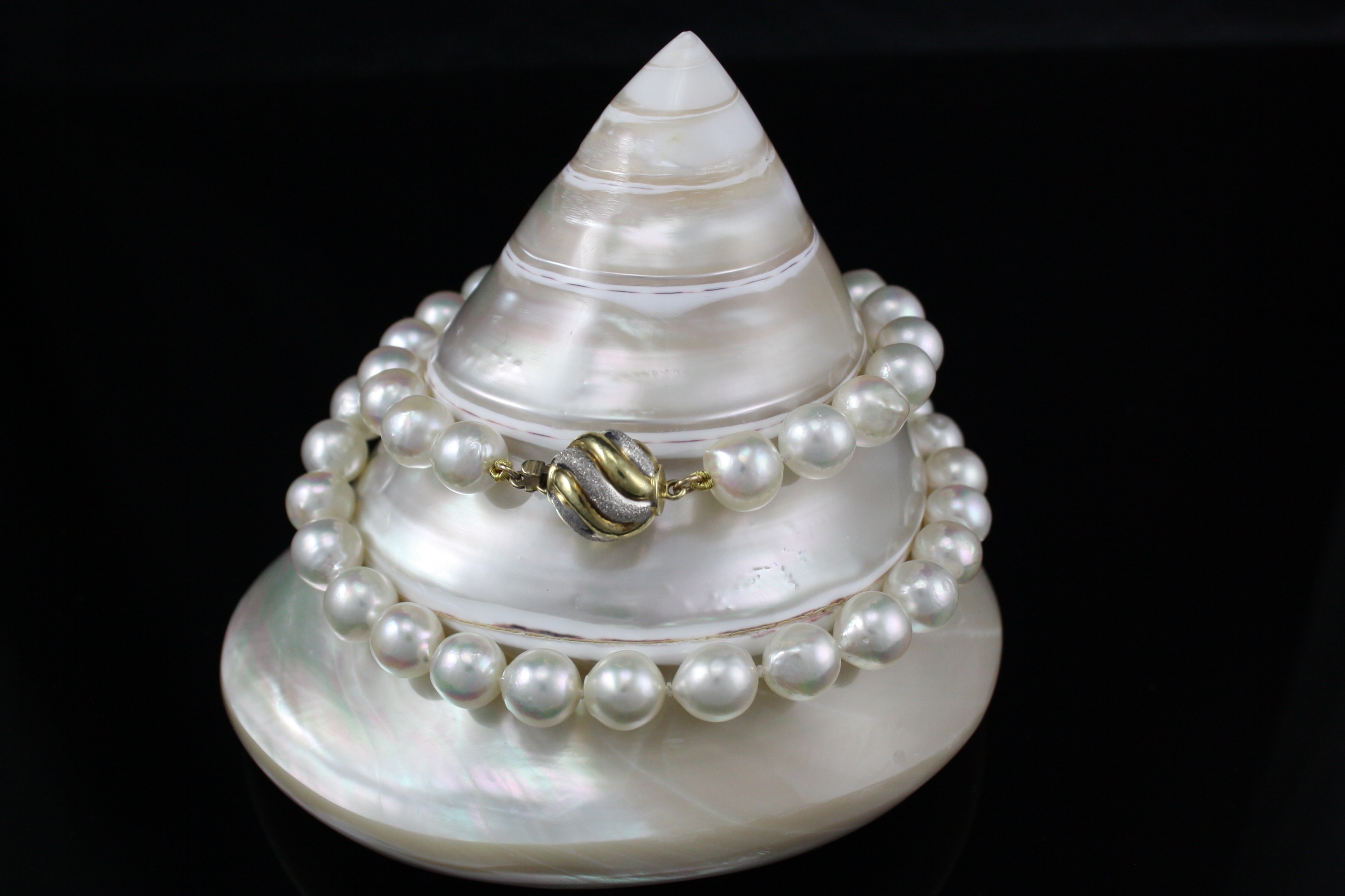 Product Code SKU16016. Akoya Cultured Pearl Necklace. 8.5mm - 9mm pearl strand with 9ct Yellow Gold clasp. Length 46cm
