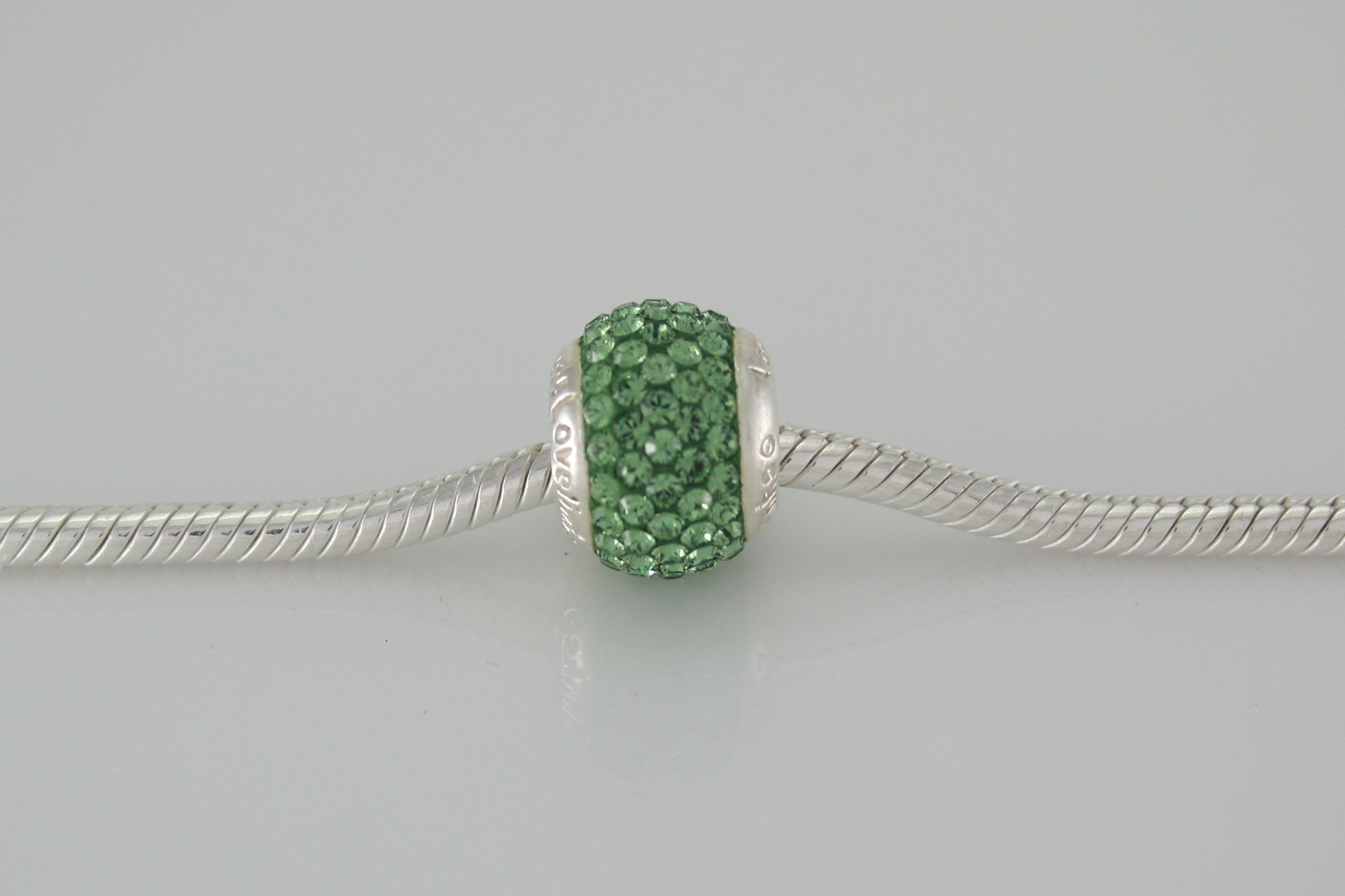 Sterling Silver bead with mint swarovski crystals.