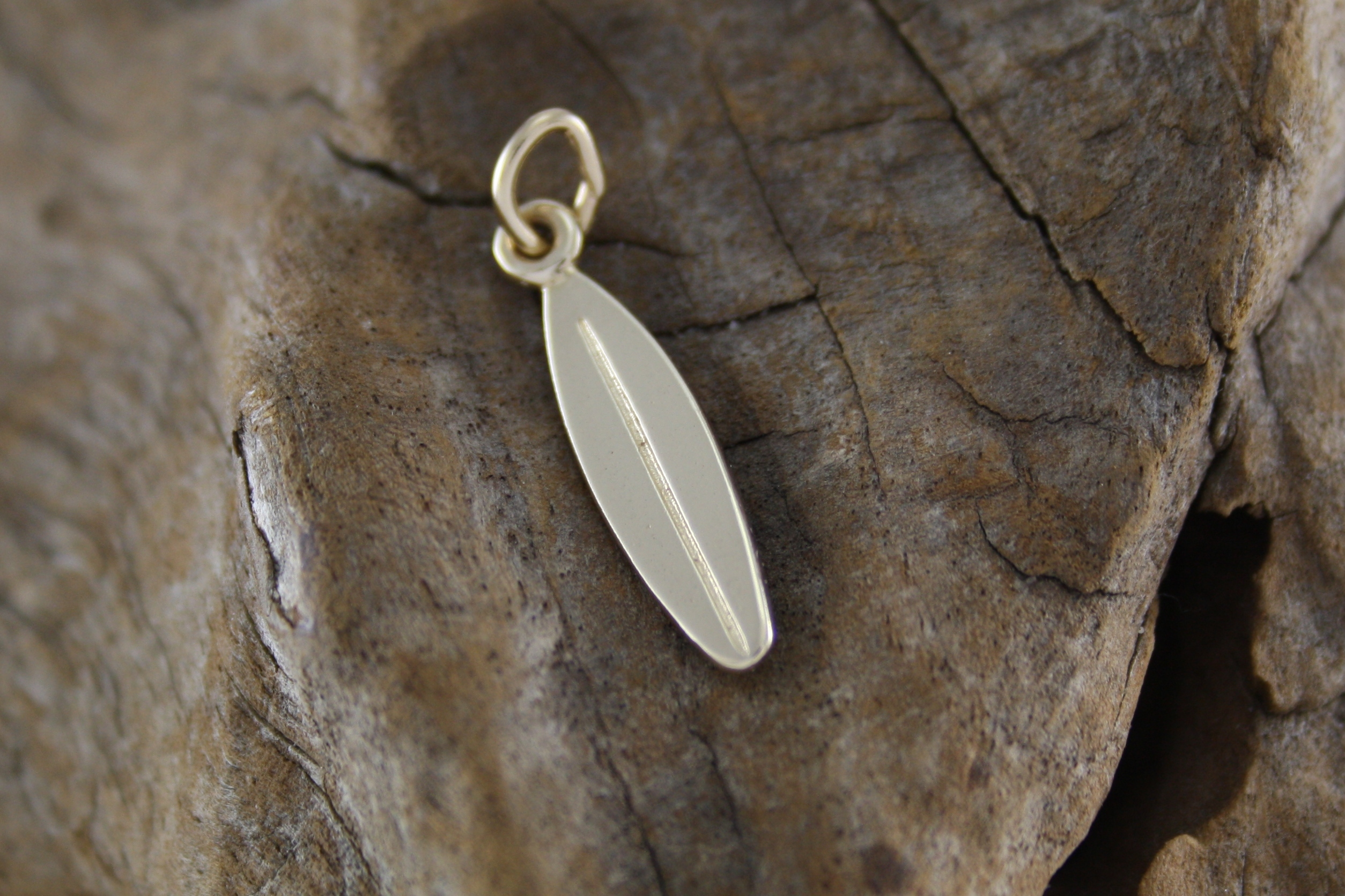 9CT Solid Yellow Gold surfboard charm. Approximate size 18.5mm x 5.0mm.