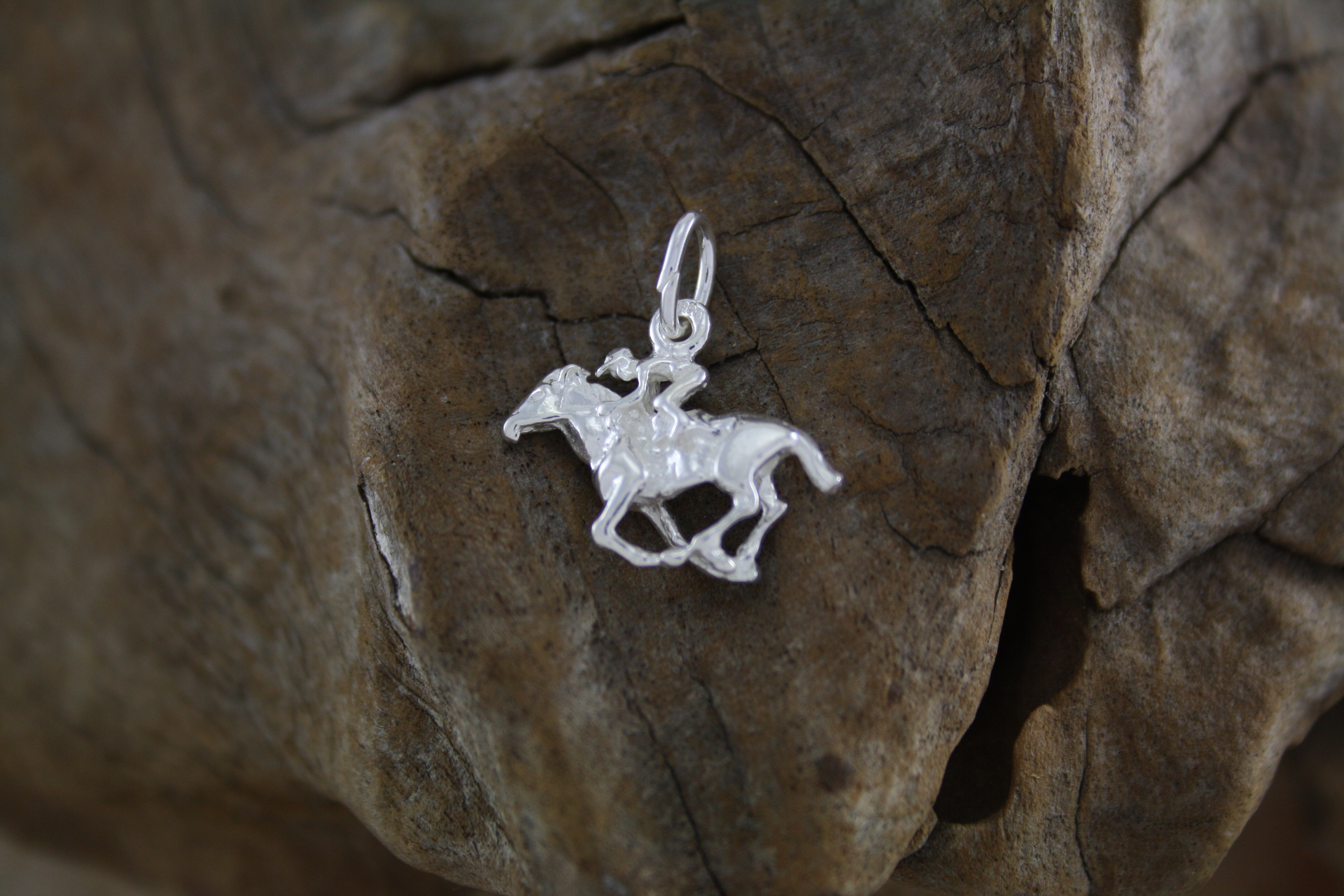 Sterling Silver Horse & Jockey charm. Approximate size 12.0mm x 15.0mm.