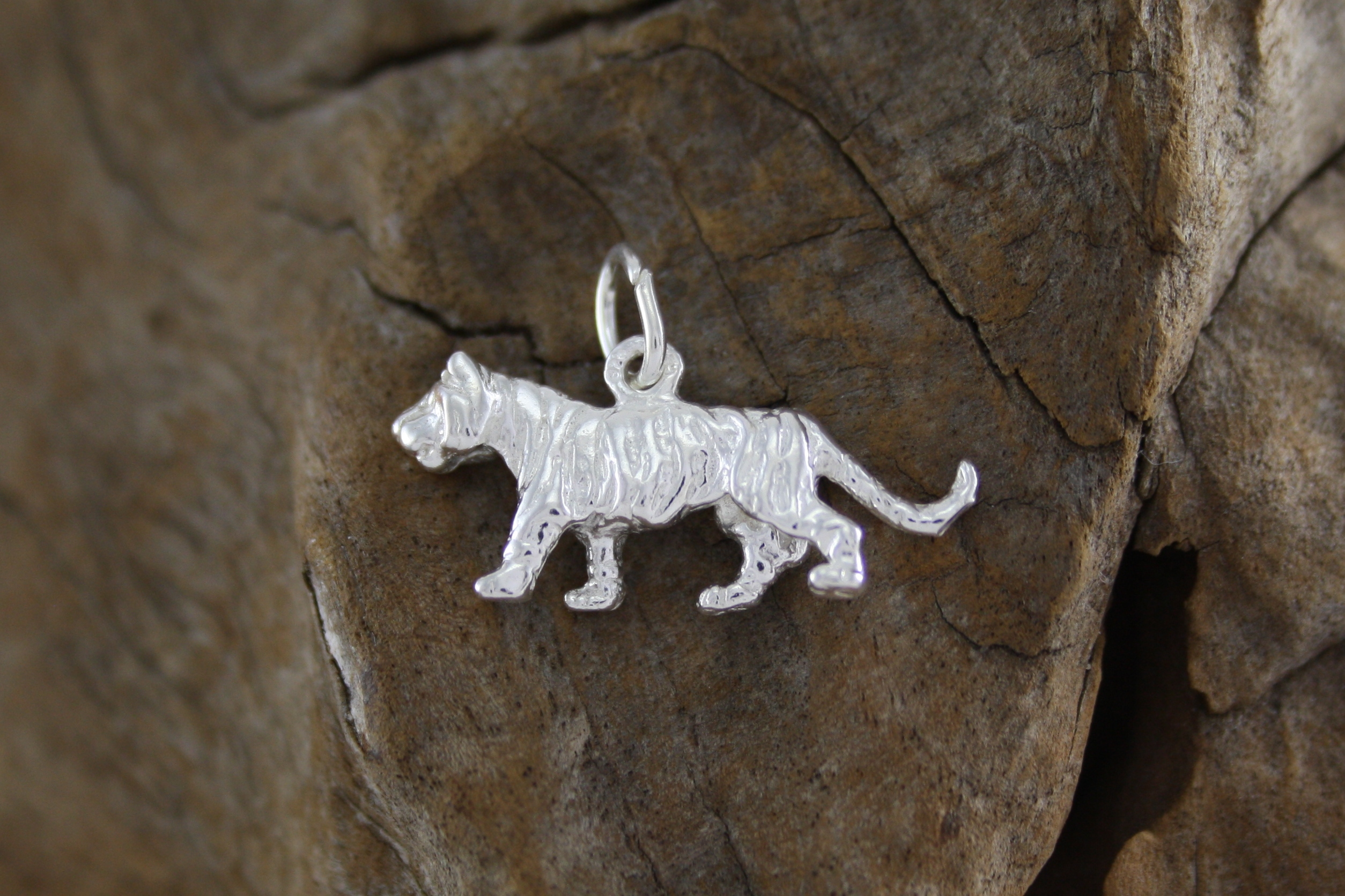 Sterling Silver Tiger charm. Approximate size 24.0mm x 9.0mm