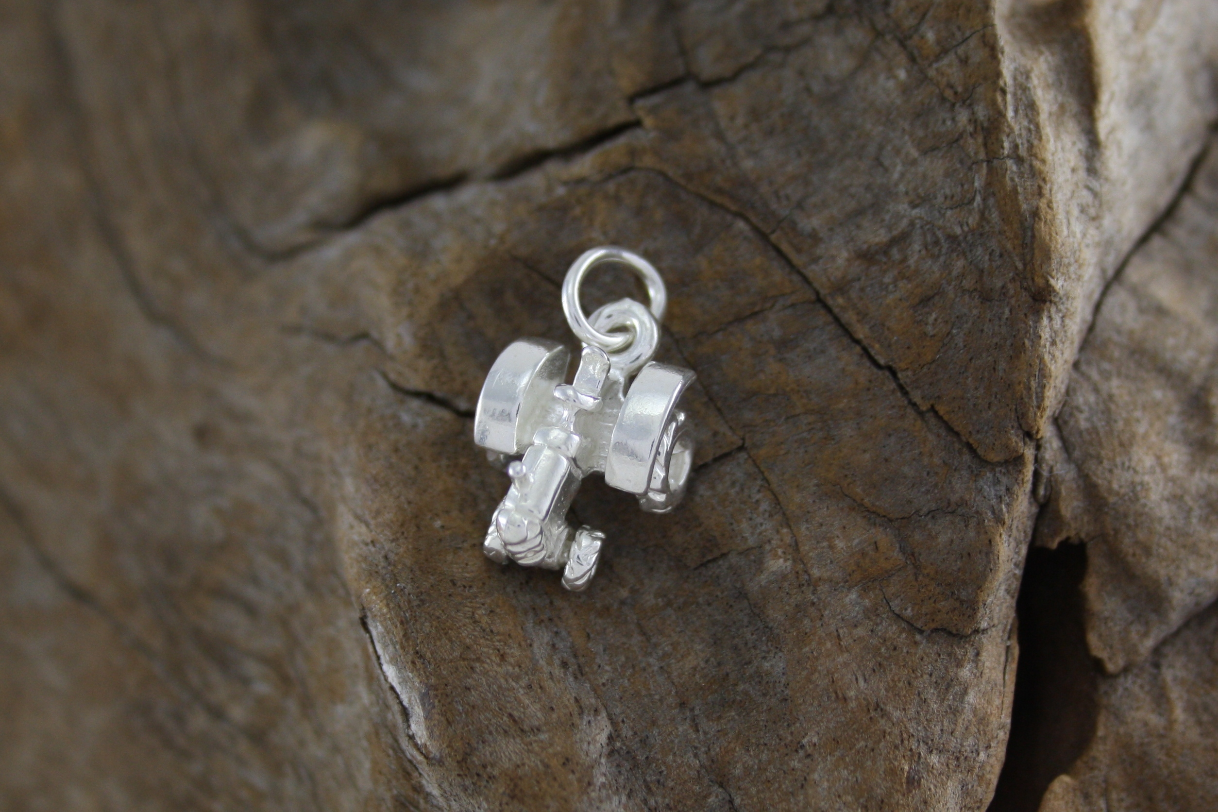 Sterling Silver Tractor charm. Tractor has front and rear moving wheels. Approximate size 11.0mm x 10.0mm