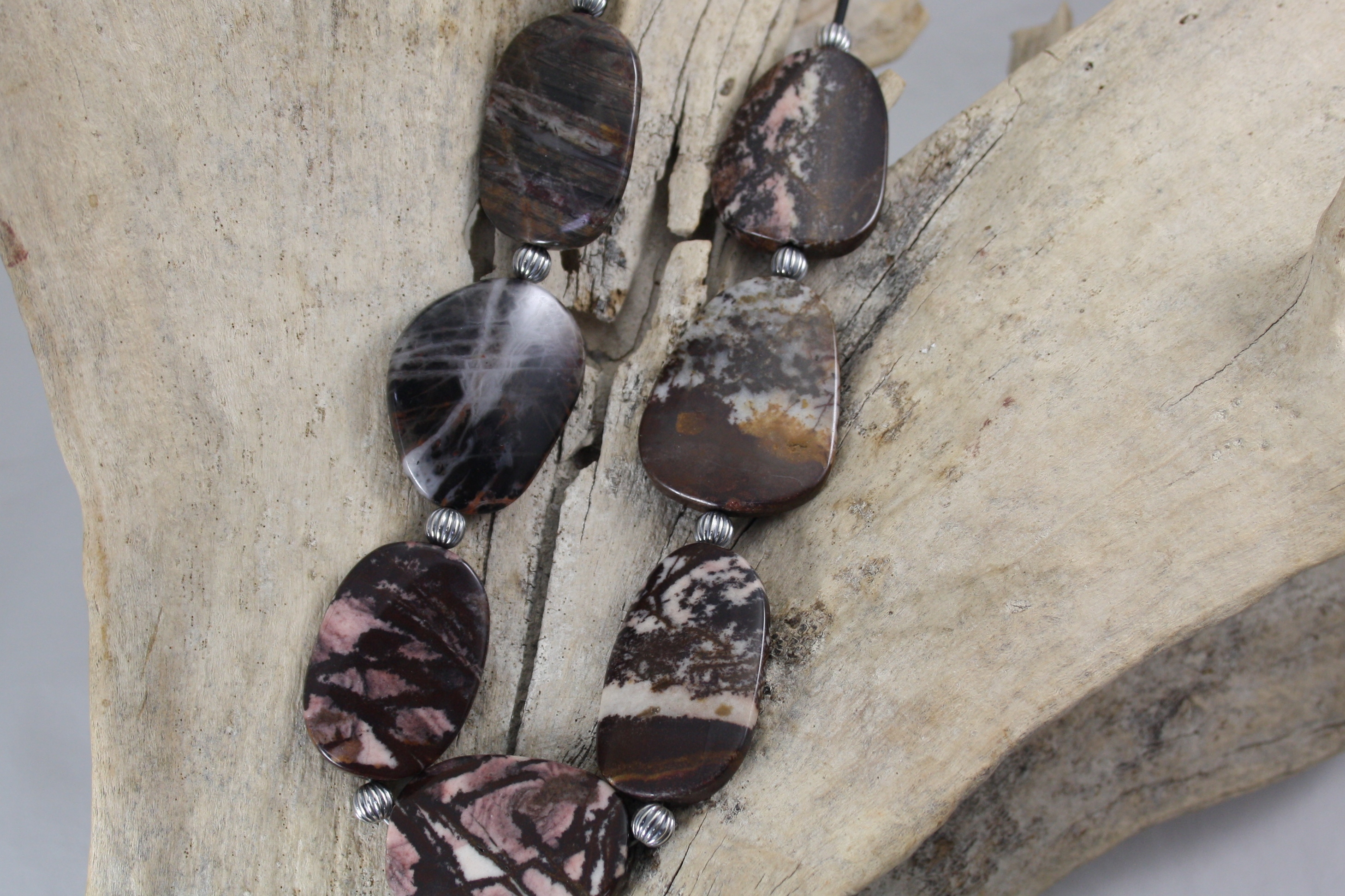 Outback Pilbara Jasper necklace with 7 freeshape beads approximately 25m x 35mm x 7mm on neoprene with sterling silver beads and clasp. Length approximately 45cm.