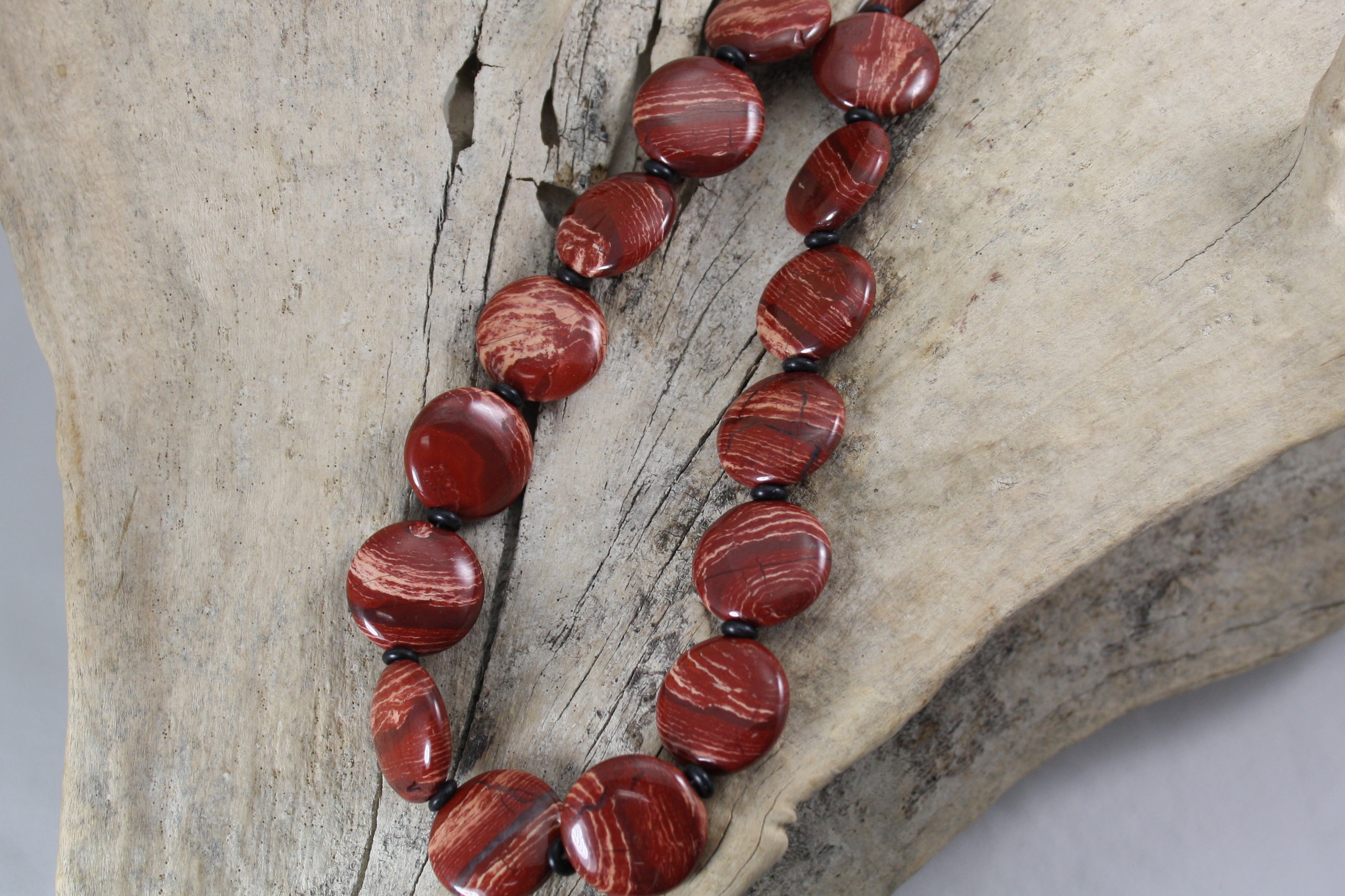 Snakeskin Jasper 19mm x 8mm round flat bead on wire with sterling silver clasp 45cm length.