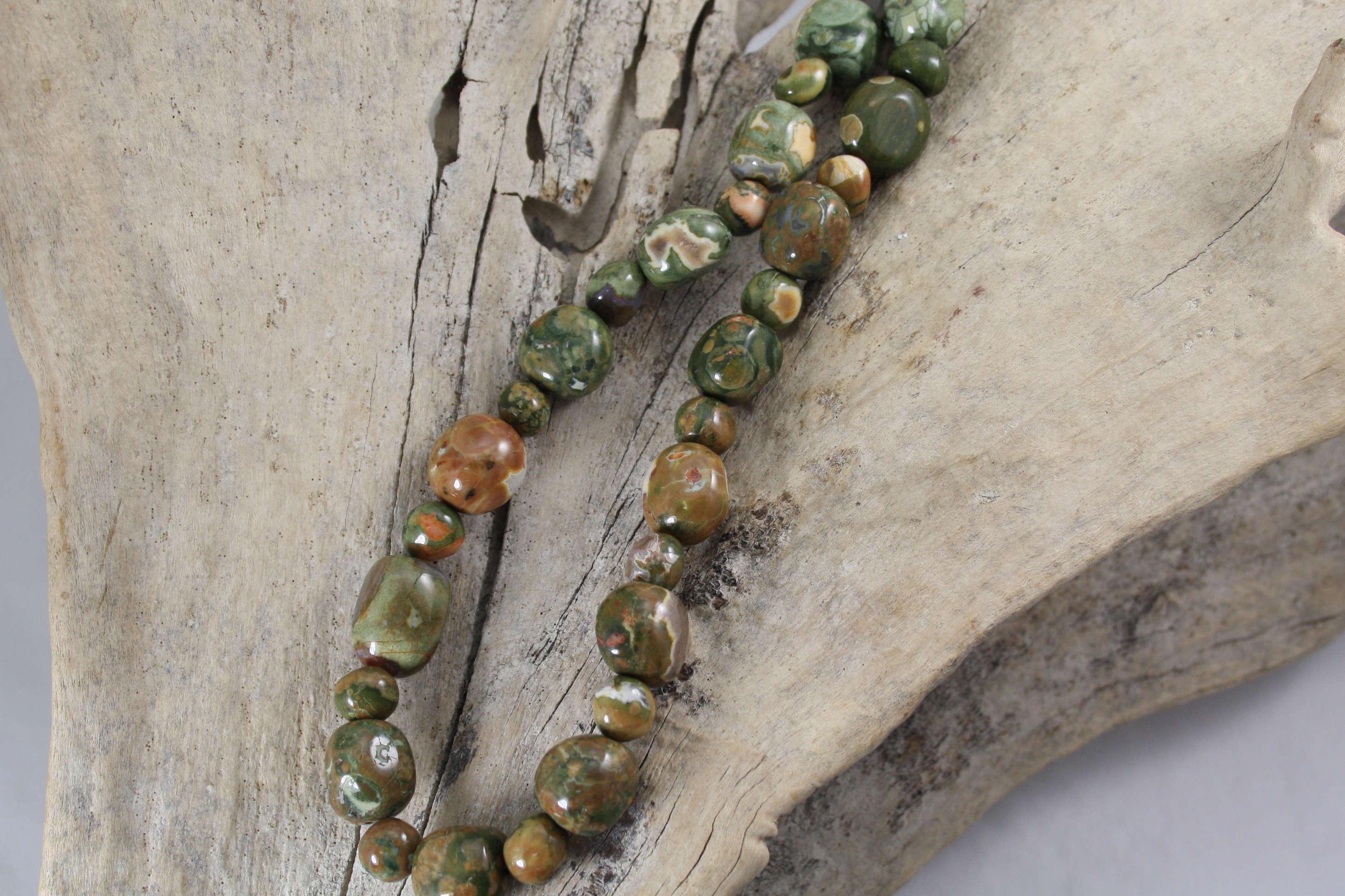Rainforest Jasper or Spherulitic Rhyolite Necklace freeshape beads approximately 13mm x 11mm x 12mm and 9mm x 9mm x 8mm with a sterling silver clasp. Length approximately 45cm