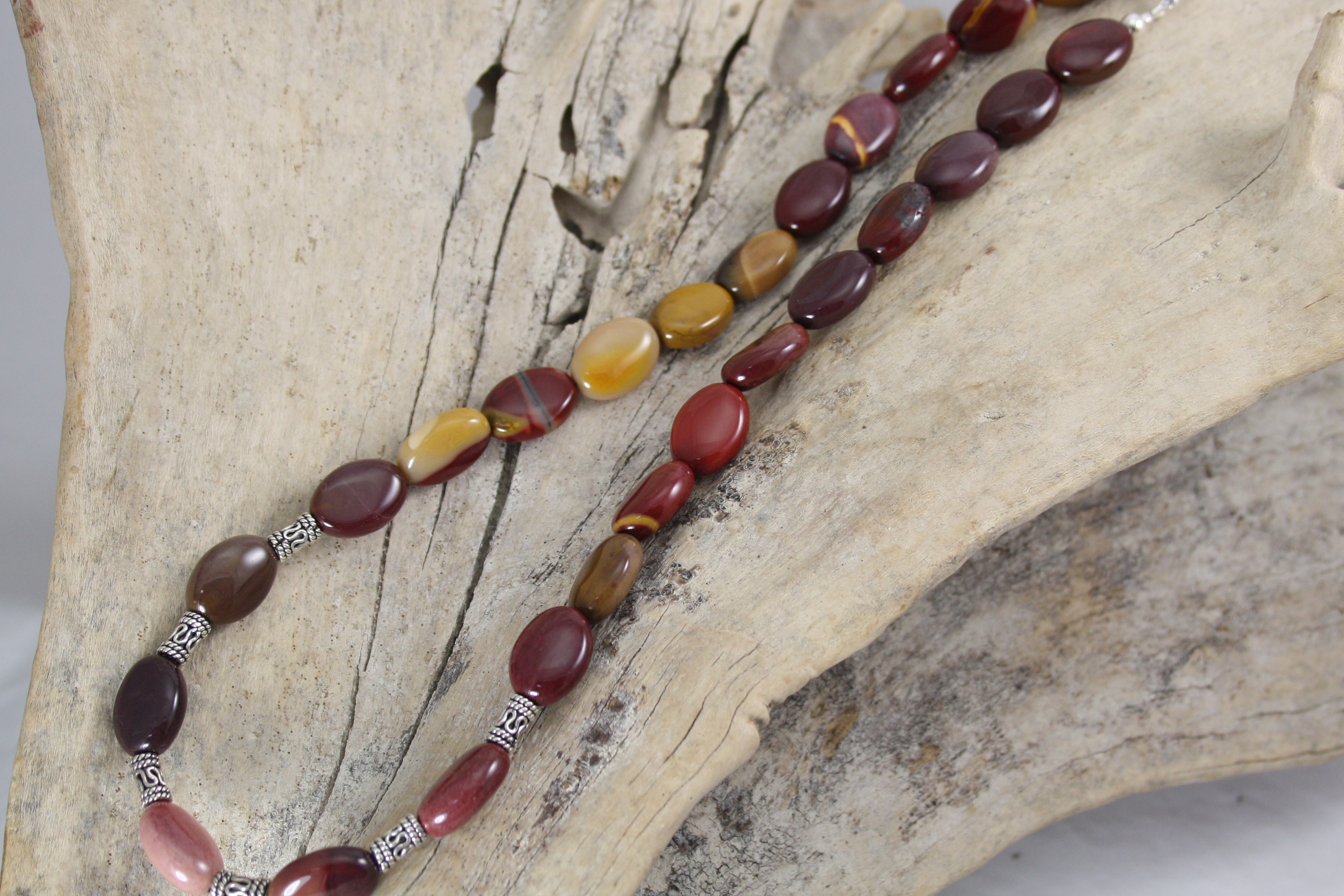 Mookaite has an interesting origin. The area in which it is found was once part of the ocean that had long since receded, leaving an inland sea. As this inland sea evaporated, billions of tiny organisms known as Radiolarian were left behind in beds upto several metres thick. These calcareous skeletal remains absorbed iron rich minerals and silica from the sea and underground vents and springs, to form Windalia Radiolarite, a hard, fine grain chert, covering an area of thousands of square kilometres. The higher concentrations of iron and silica at the Mooka Station deposits, has produced this unique example of Radiolarite we know as Mookaite. This formation is from the Early Cretaceous period, or around 120 million years oldMookaite is fashioned into many items such as jewellery, carvings and ornaments.