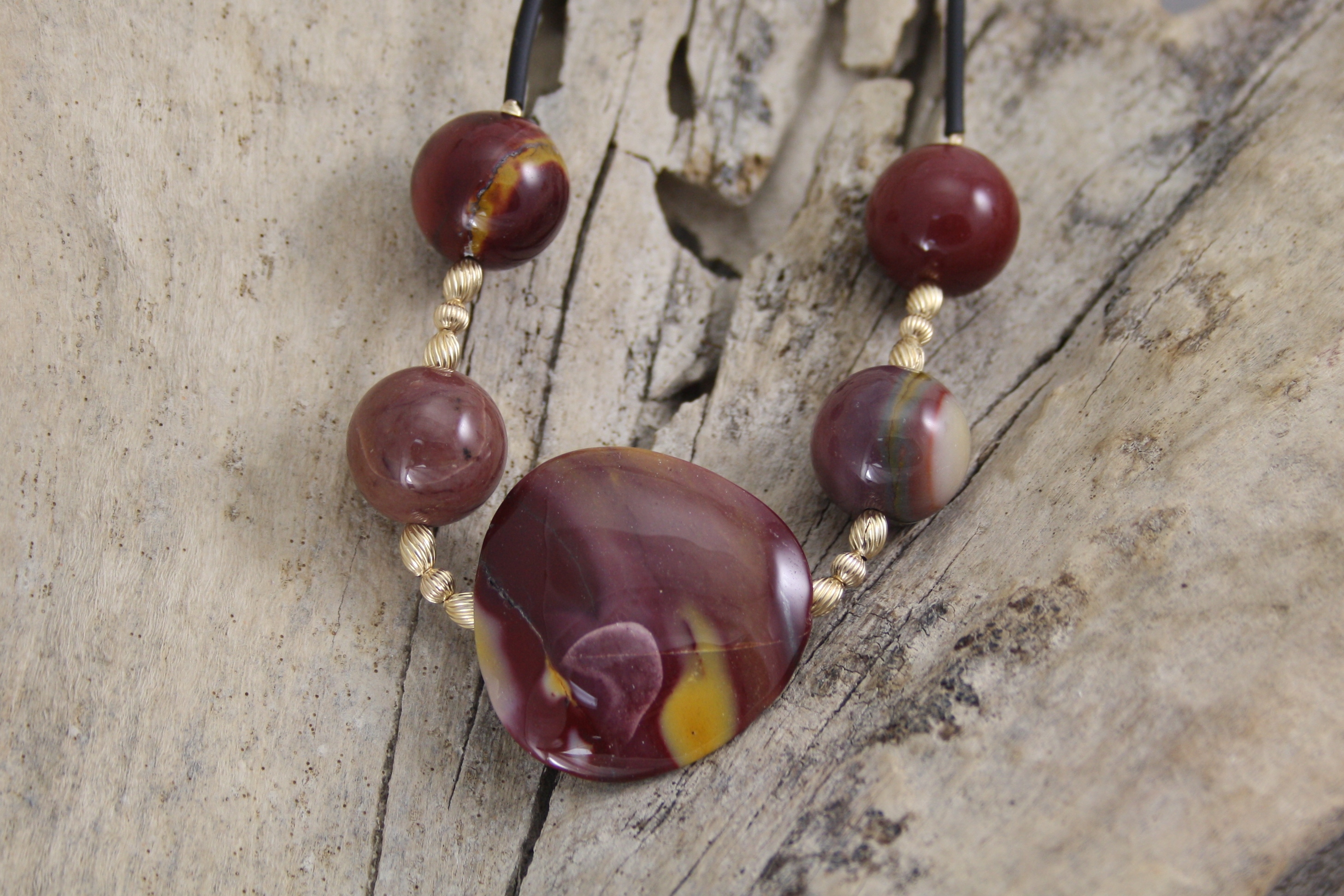 Mookaite Necklace 1 of freeshape bead 30mm x 30mm x 8mm, 4 of 14.5mm round beads with gold filled beads and clasp on neoprene. Length approximately 45cm.