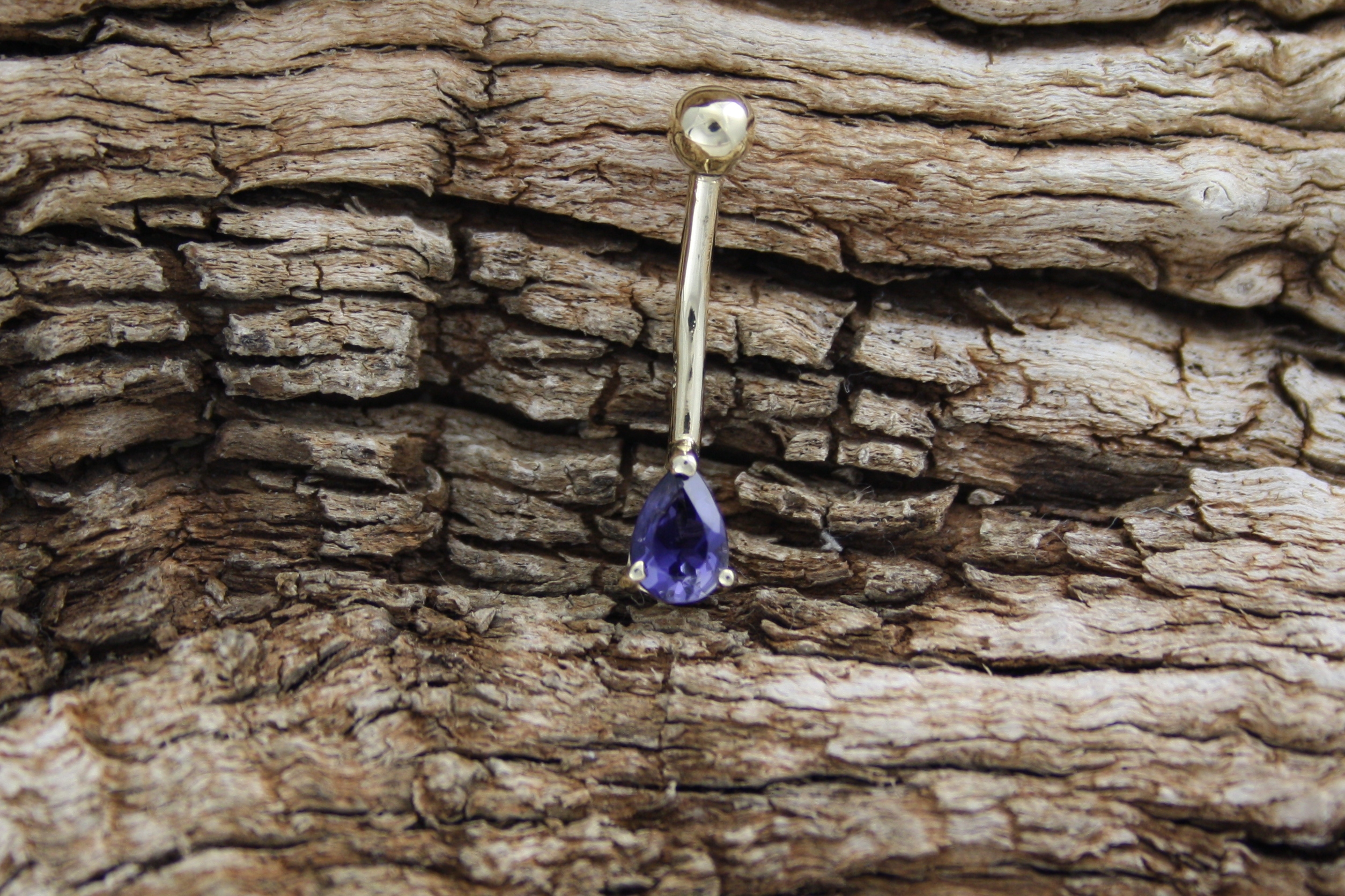 9ct YG Iolite belly bar. 5mm x 4mm pear shape Iolite. Beautifully presented and gift boxed.