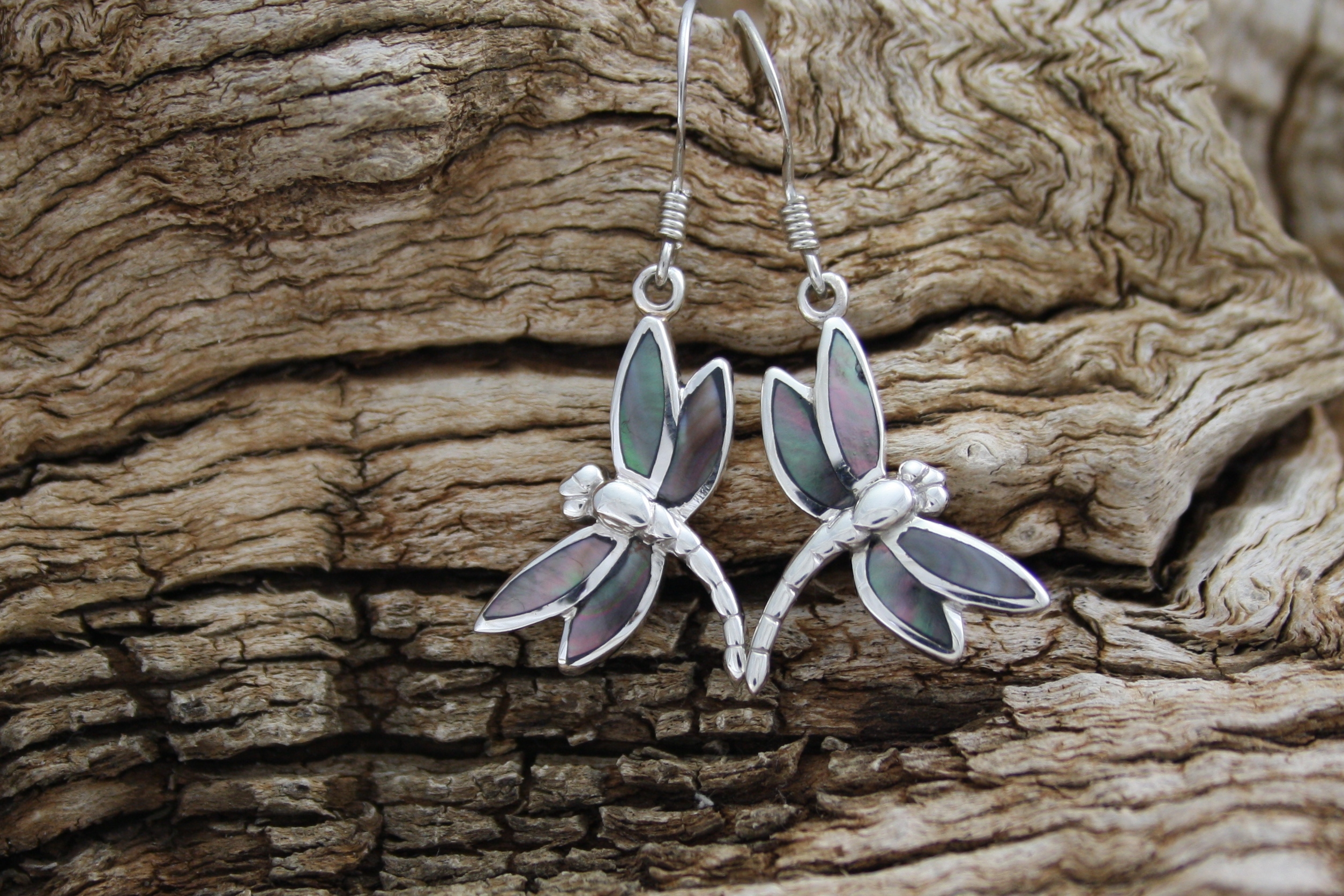 Product Code SKU8258. Sterling Silver Dragonfly hook earrings, black mother of pearl, rhodium plated, dragonfly size 18mm x 14mm. Using the rich natural materials of shell and sterling silver our artists have created this piece as a reflection of Australias natural environment. Beautifully presented and gift boxed.