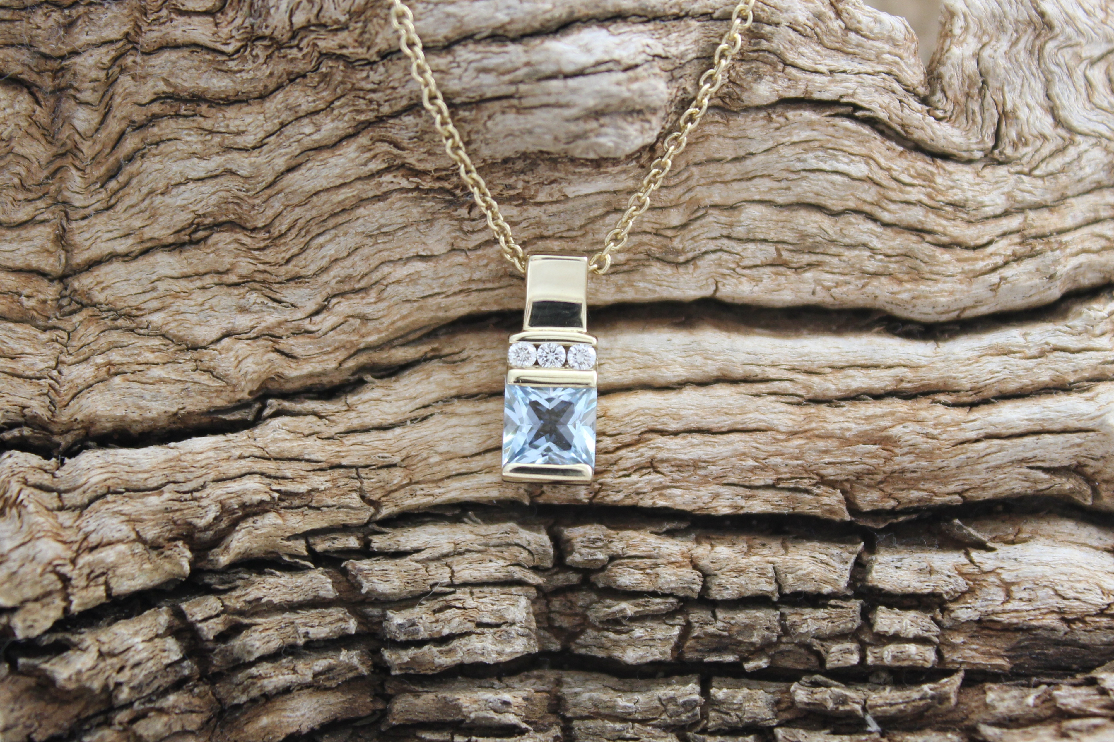 Product Code SKU13019. 9ct Yellow Gold 5mm Princess cut Aquamarine with 3 x dia = 1.5pt diamond pendant. Seawater is meant to be the translation from Latin. A very apt description for this beautiful stone has away of looking like captured water in crystal. Aquamarine looks stunning in either white or yellow gold.