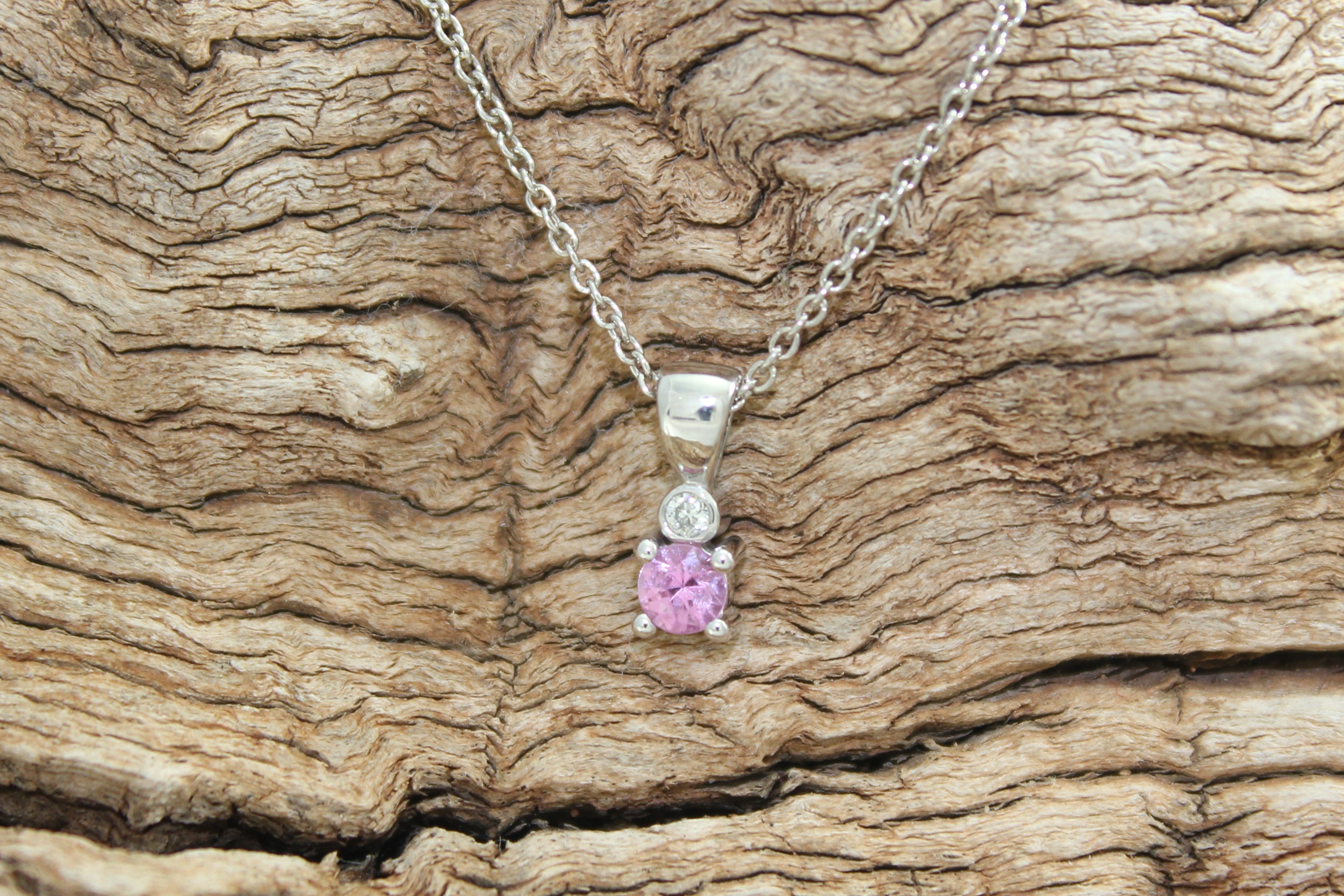 Product Code SKU13035. 9ct White Gold Pink Sapphire Pendant. 3.5mm round pink sapphire with 1 approx 2pt diamond. Part of Corundum family Sapphires come in a variety of colours Australian Sapphires range in colour from dark royal blue to a strong rich blue we also have Parti Sapphires which bring us multi hued stones of green yellow and blue.