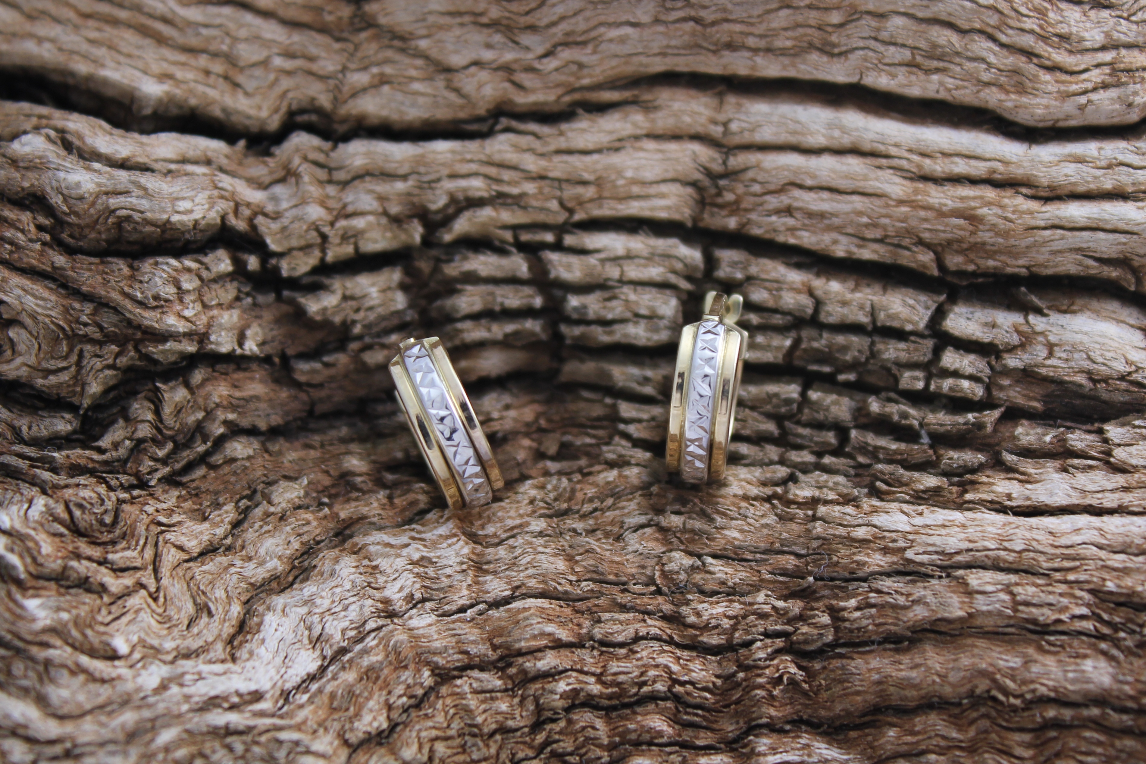 9ct Two tone YG & WG Hoop earrings. 8mm centre diameter, diamond cut centre in white gold. Earrings beautifully presented and gift boxed.