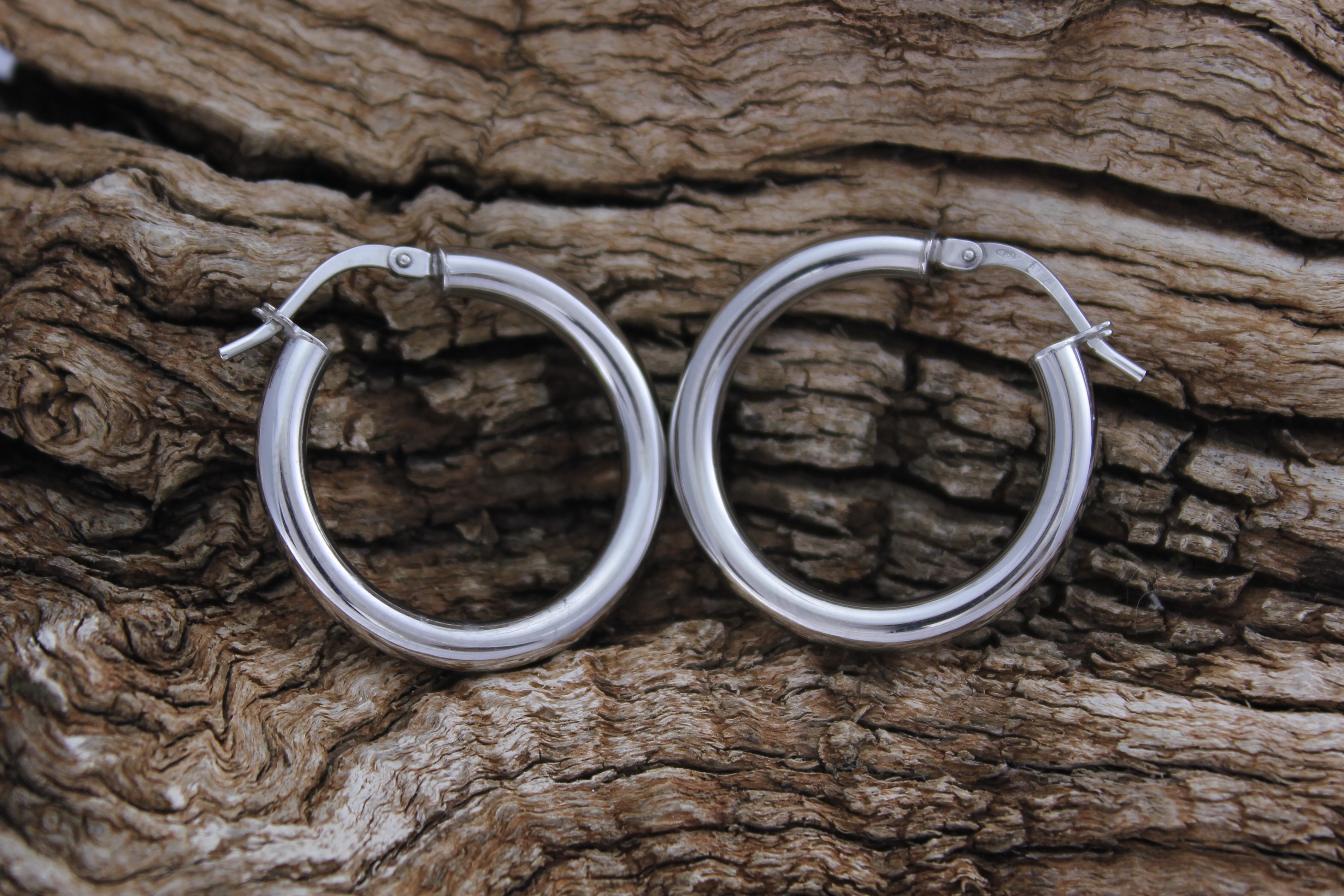 18ct WG 20mm x 3mm plain hoops. Earrings beautifully presented and gift boxed.