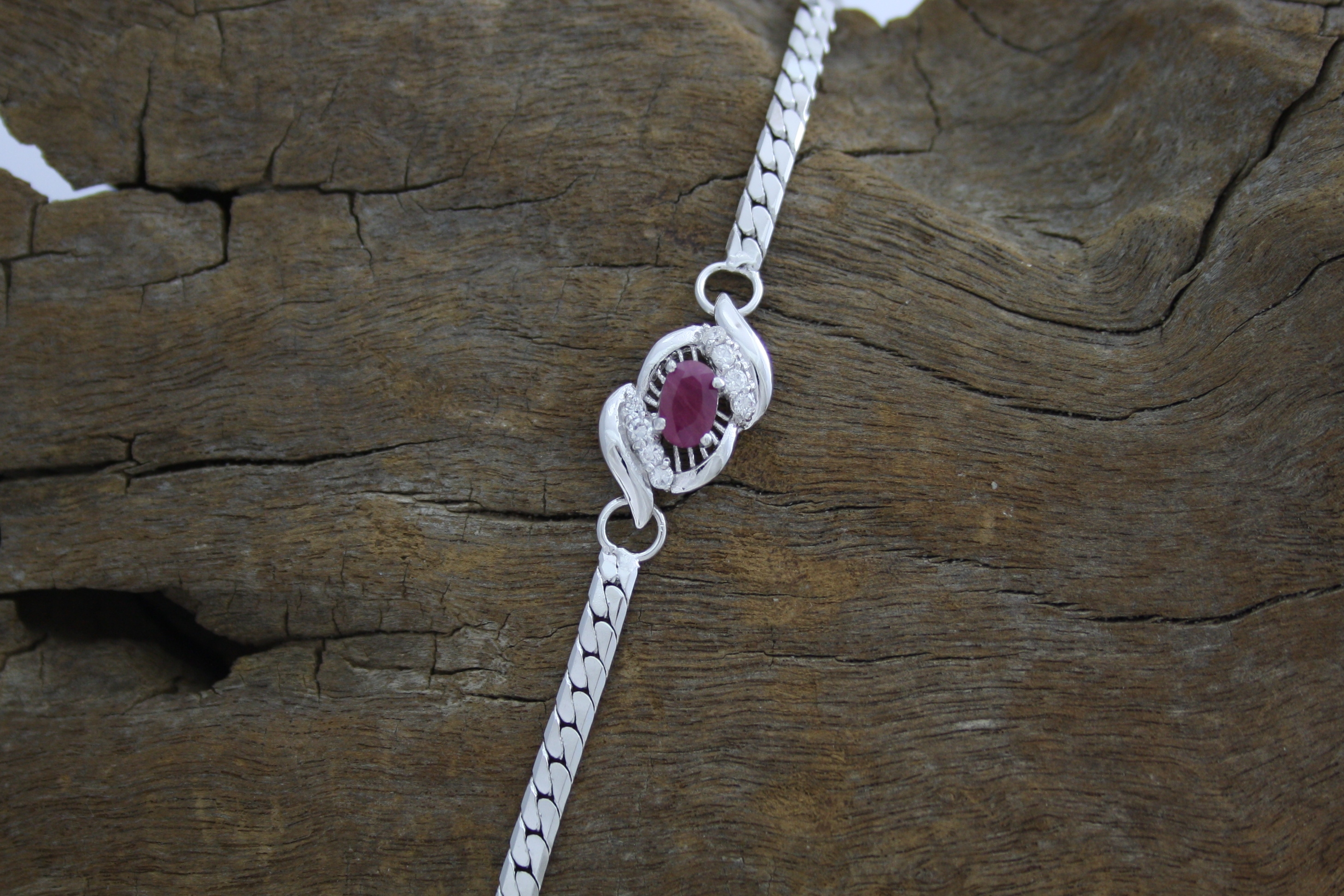 Sterling Silver Ruby bracelet with 1 claw set Ruby and 8 claw set cubic zirconia. Bracelet has adjustable extender. Rhodium plated. This bracelet comes beautifully presented and gift boxed.