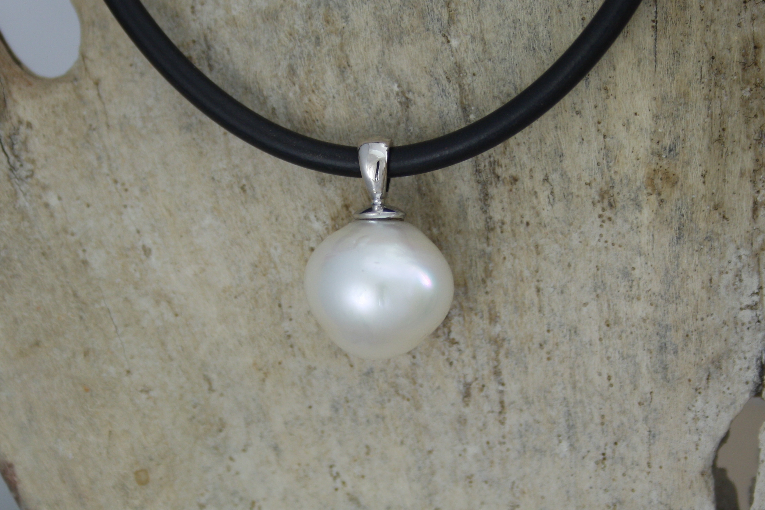 Product Code SKU10066. 14.5mm South Sea Pearl 18Ct White Gold South Sea Pearl pendant. South Sea Pearls come from pearl farms in tropical waters in the southern hemisphere. Generally the pearls grown in this area range in size from 9mm to 18mm (sometimes larger) The culturing of pearls has been active in Australia since the 1950's. The process for culturing pearls requires a technician to implant a seed in the animal which then is coated in a secreted nacre by the animal. This is an ongoing process over a number of years. The depth of this nacre is what gives the South Sea Pearl its world renowned lustre. You will find a colour variation which can be a sign of the water temperature and the food source for the animal in any particular area. Beautifully presented on a display chain and gift boxed.