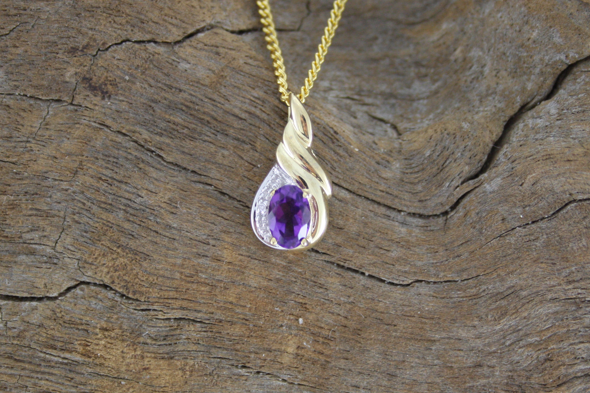 Product Code SKU7002. 9ct Yellow Gold 6mm x 4mm Oval Amethyst & Diamond Pendant. One of the quartz family Amethyst ranges from pale purple to a deep rich purple has a long history of use in many royal pieces and various religious orders. Amethyst has been suggested to ward of the effects of alcohol whatever its use the stone is a very rich and eye attracting stone in any many different settings or even as beads.