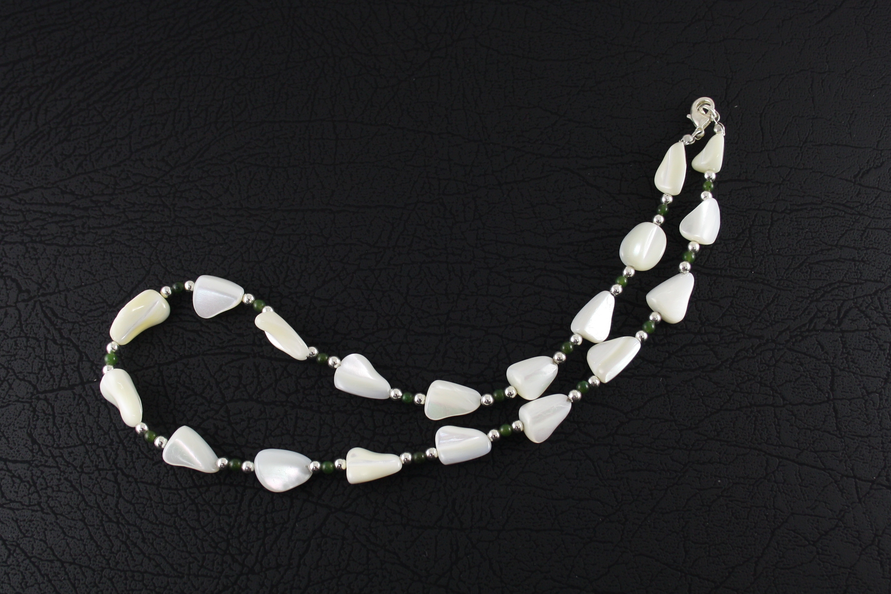 Product Code SKU20501. Mother of Pearl and Jade necklace with silver plated beads and clasp. Length approximately 45cm.