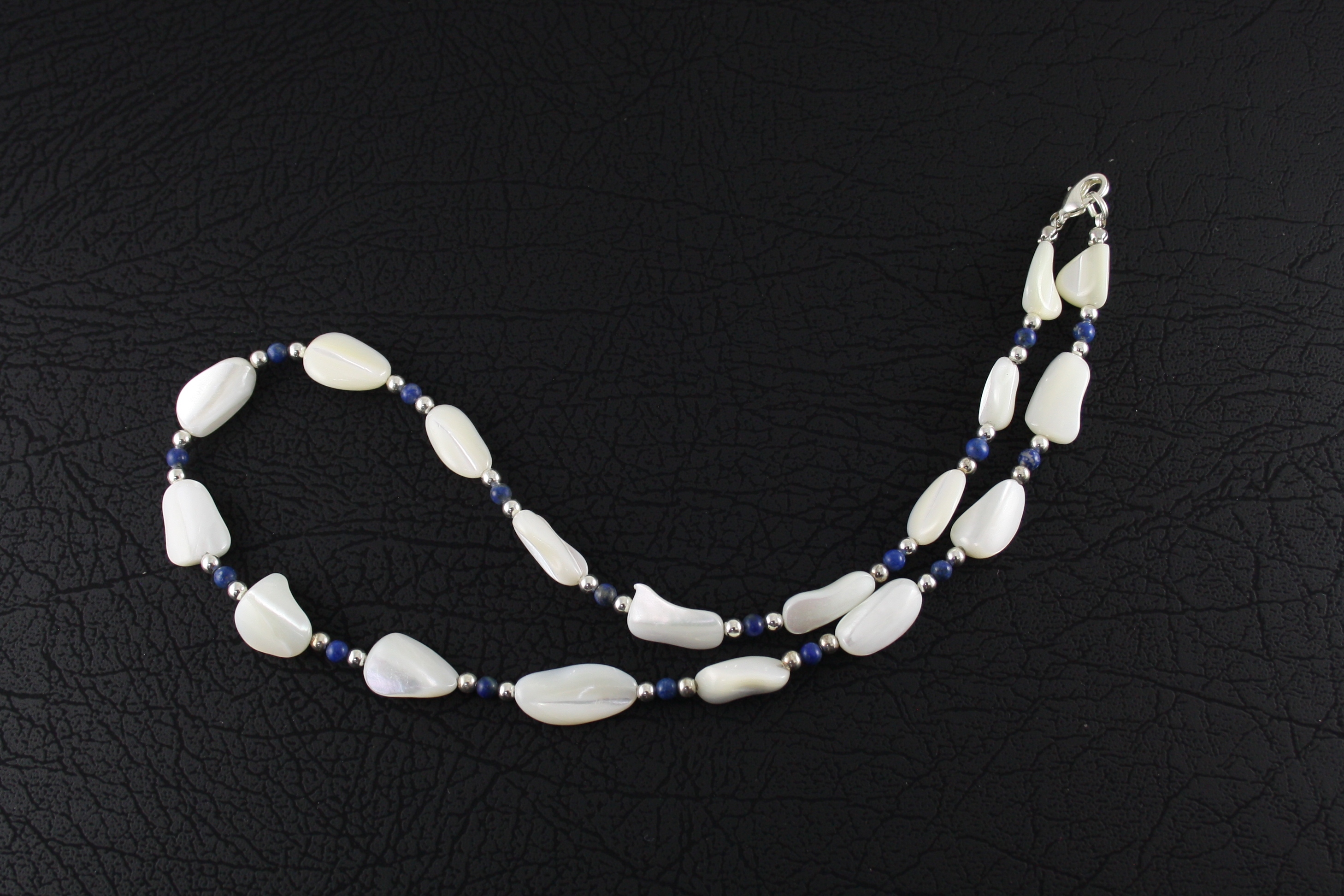 Product Code SKU20503. Mother of Pearl and Lapis Lazuli necklace with silver plated beads and clasp. Length approximately 45cm.