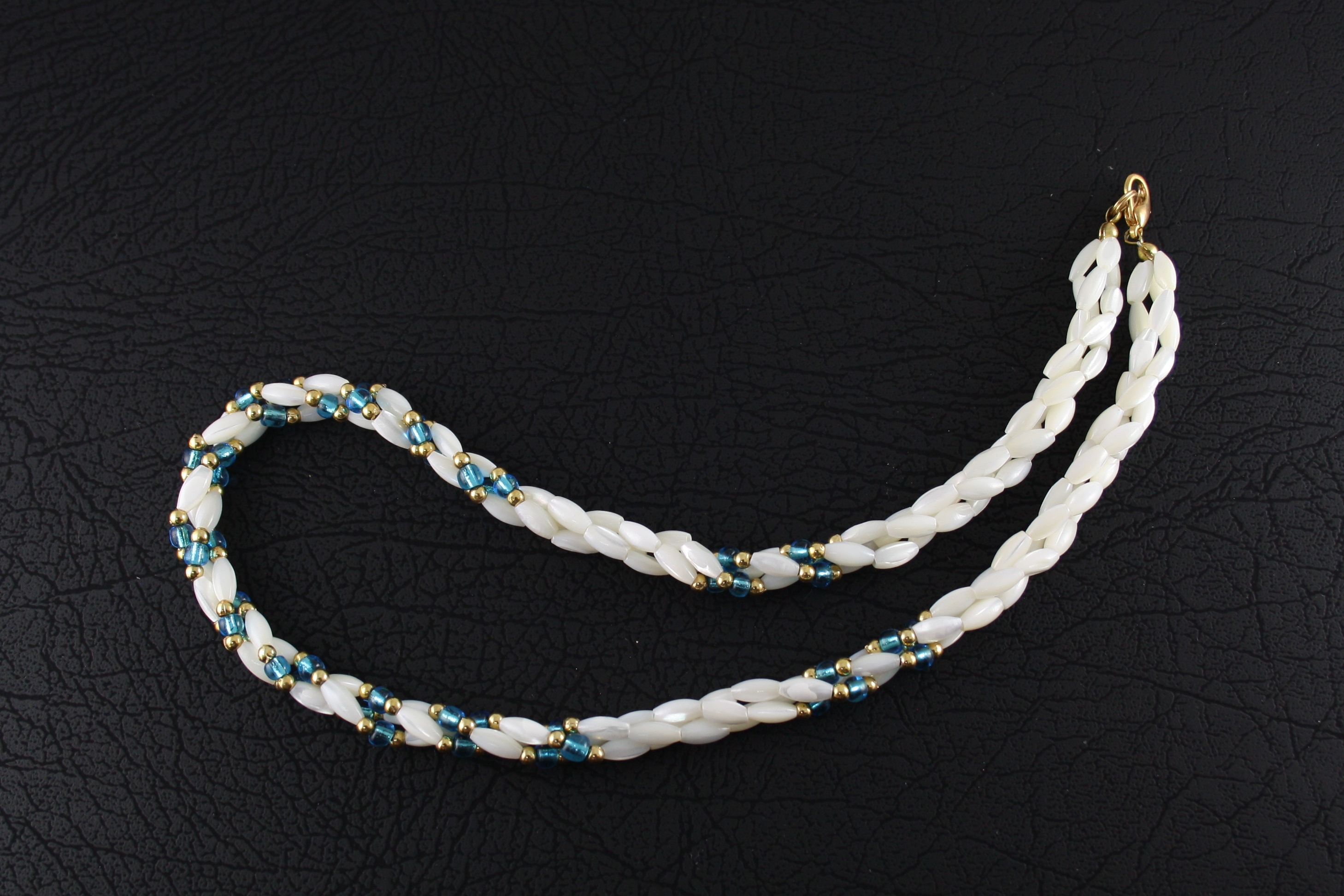 Product Code SKU20627. Mother of Pearl and turquoise blue glass bead necklace with gold plated beads and clasp. Length approximately 45cm.