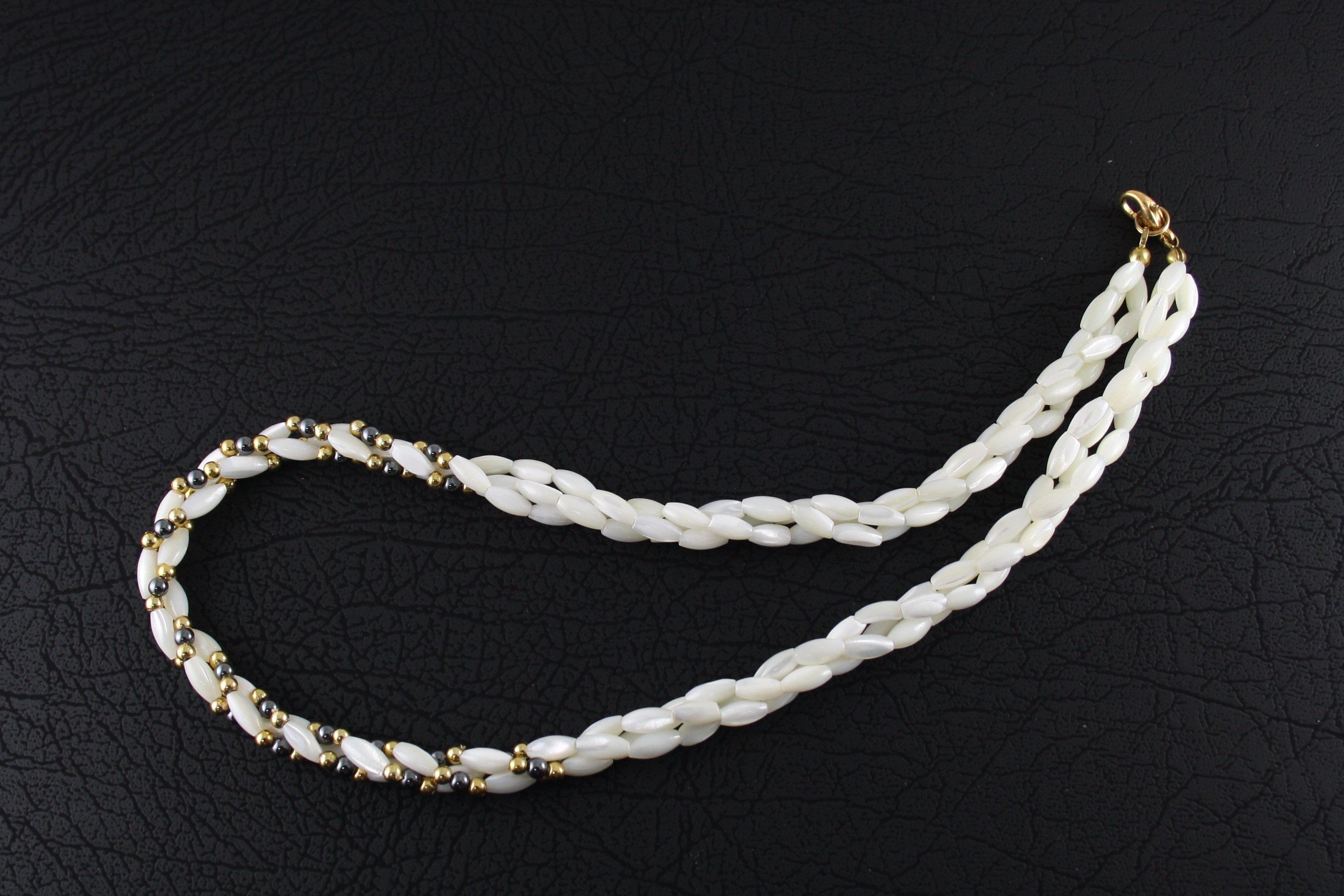 Product Code SKU20625. Mother of Pearl and Iron Ore necklace with gold plated beads and clasp. Length approximately 45cm.
