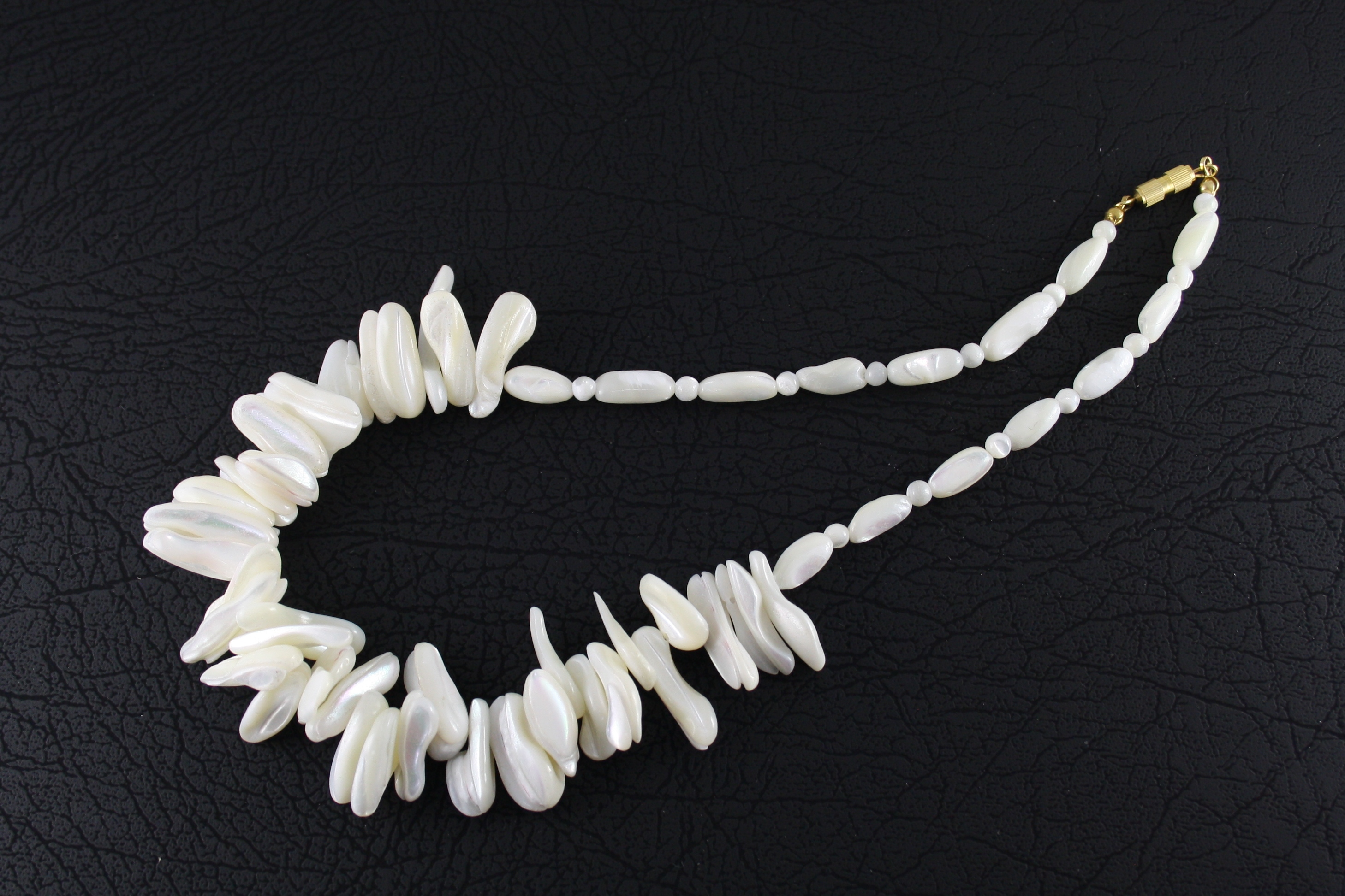 Product Code SKU20630. Mother of Pearl necklace with gold plated clasp. Length approximately 45cm.