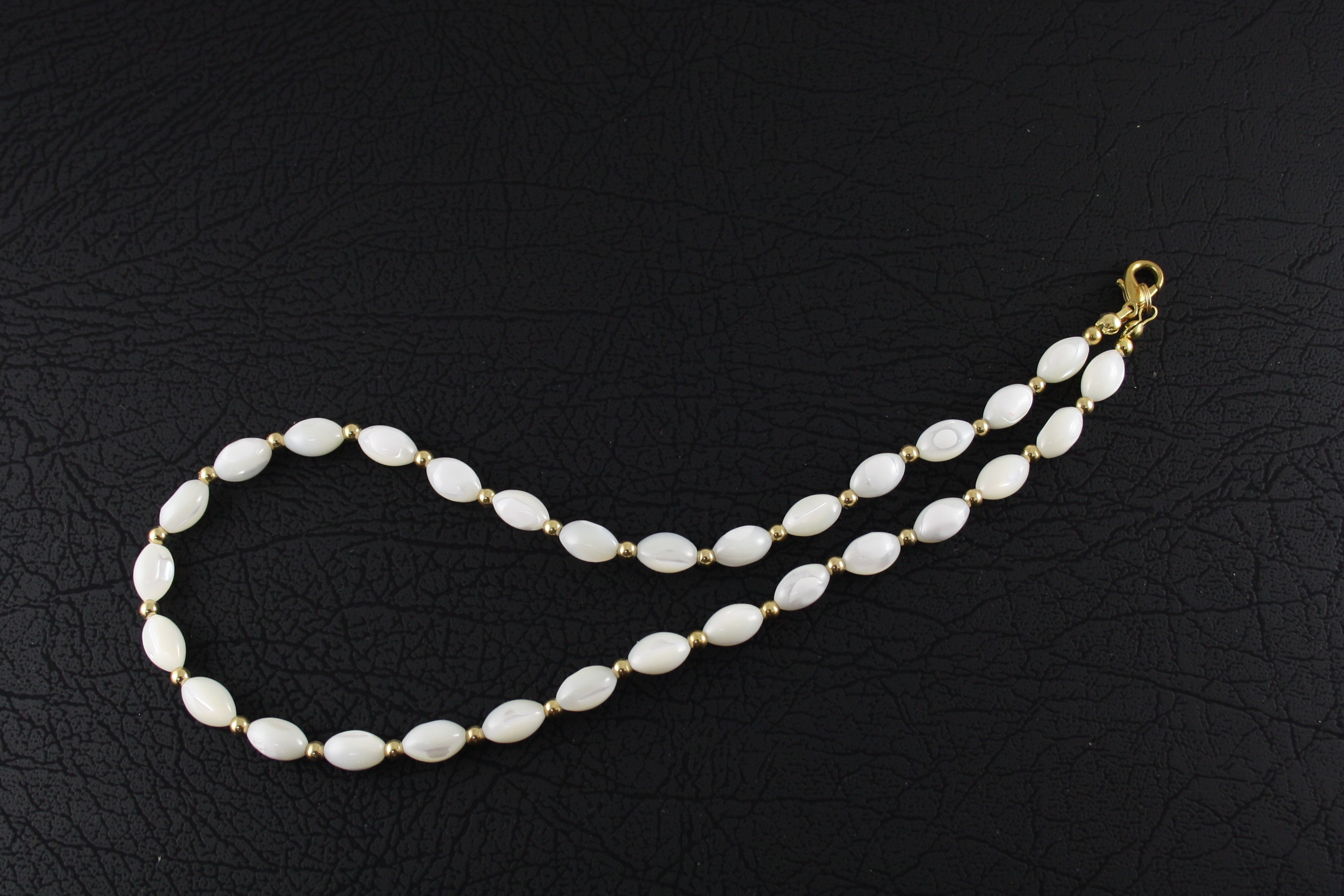 Product Code SKU20634. Mother of Pearl necklace with gold plated beads & clasp, mother of pearl beads approximately 6mm x 9mm. Length approximately 42cm.