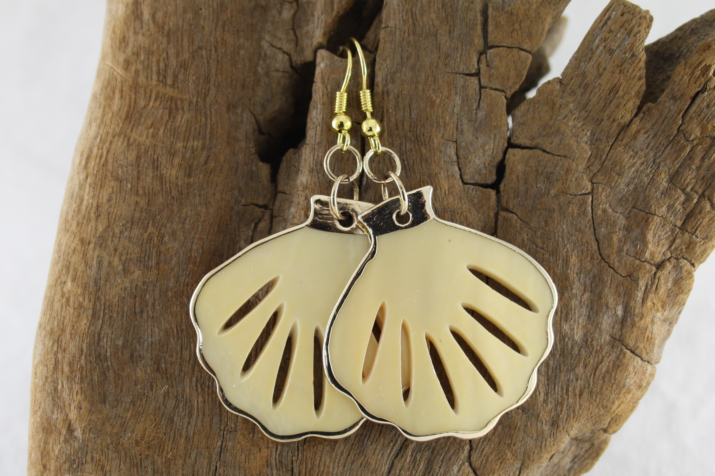 Product Code SKU20649. Mother of Pearl yellow shell shape earrings, gold plated hooks. Approximate size of shell is 37mm x 37mm.
