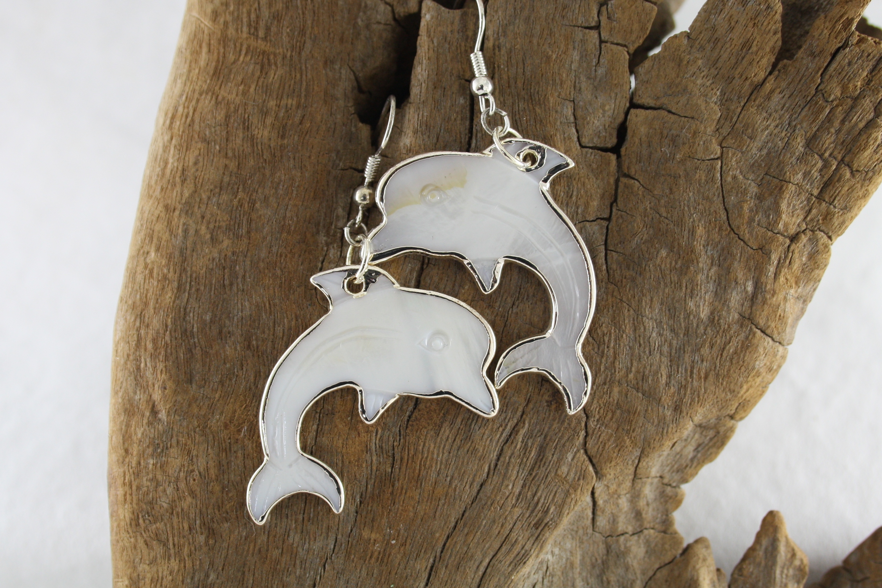 Product Code SKU20648. Mother of Pearl dolphin shape earrings, silver plated hooks. Approximate size of dolphin is 35mm x 35mm.