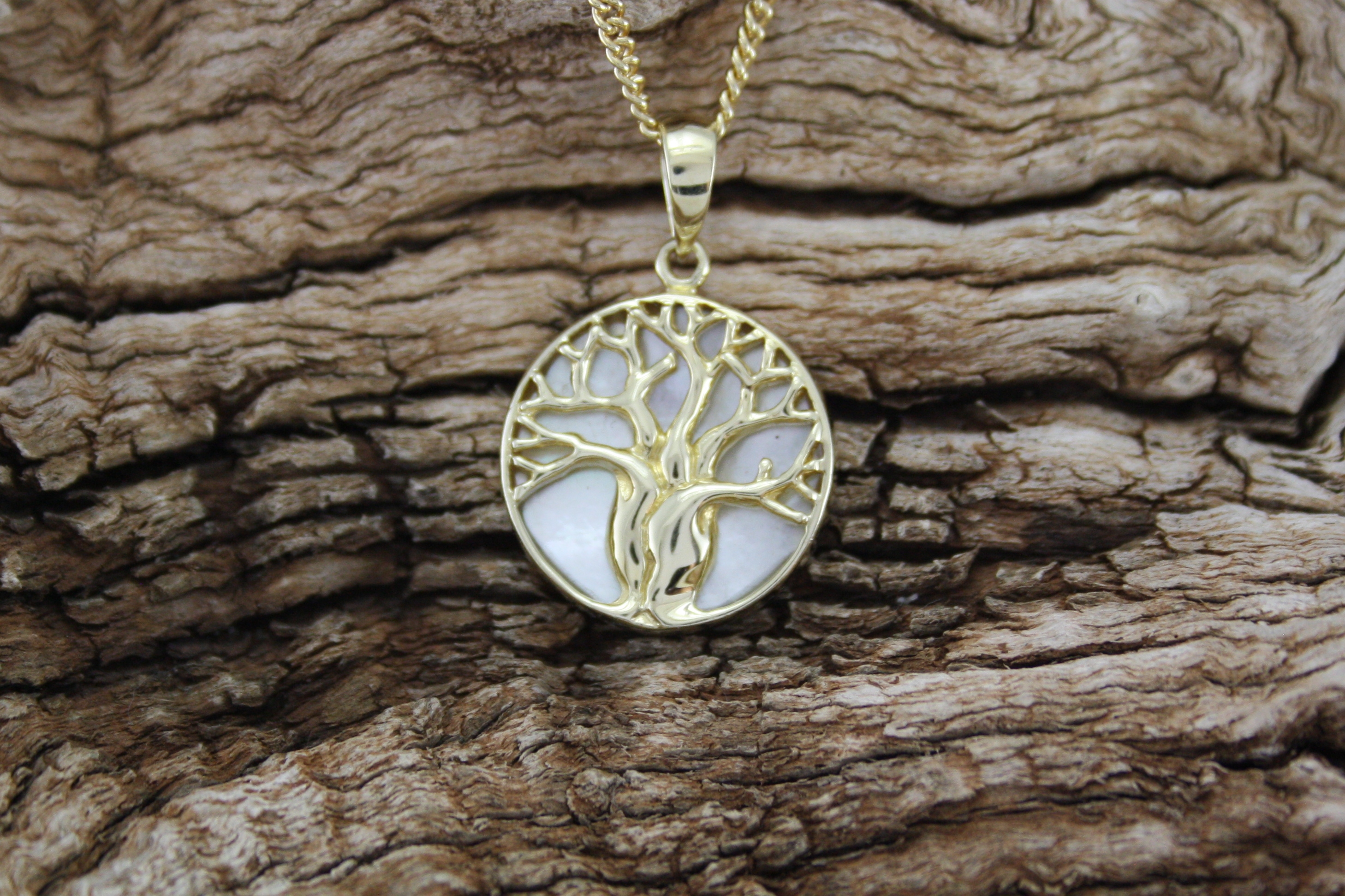 9CT Yellow Gold Tree of Life Pendant, white mother of pearl. Round shape. Approximately 18mm diameter.