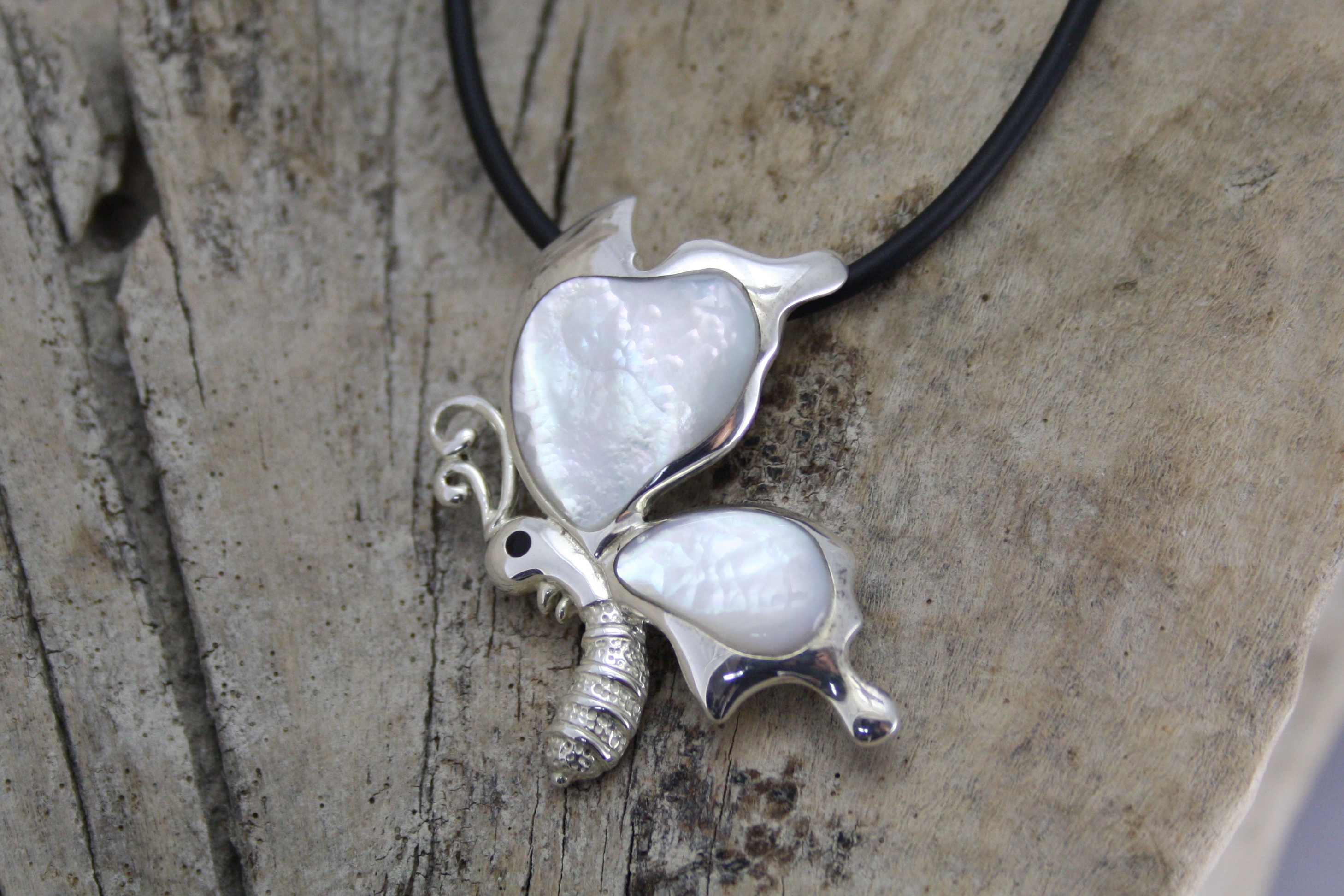 Product Code SKU8337. Sterling Silver butterfly pendant, white mother of pearl, butterfly approximate size 35mm x 27mm. Using the rich natural materials of shell and sterling silver our artists have created this piece as a reflection of Australias natural environment. Beautifully presented on a display chain and gift boxed.